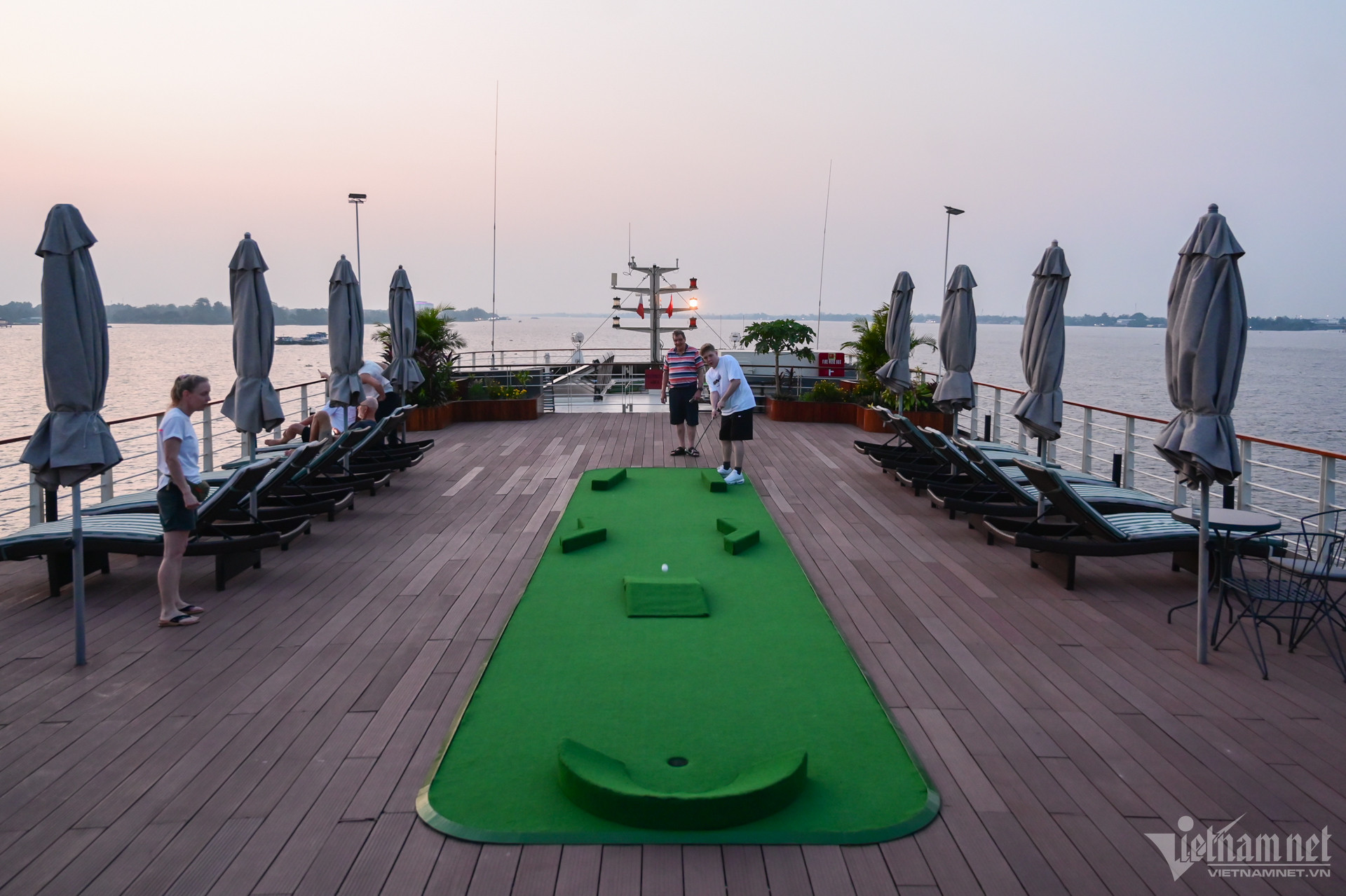 Đặc biệt, du thuyền được thiết kế như một resort cao cấp với đầy đủ các tiện ích giải trí như sân golf, hồ bơi, rạp chiếu phim… Các hoạt động từ thư giãn trên boong, tắm nắng, ngắm hoàng hôn hay chỉ đơn giản là ngồi trò chuyện thưởng thức rượu vang dưới ánh chiều tà là điều thú vị tại đây.