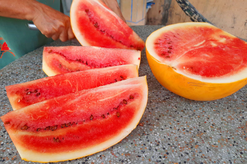 Trái dưa hấu vàng nặng hơn 6kg được chưng Tết đến nay đã hơn 1,5 tháng nhưng vẫn không bị hỏng. Sau đó người dân đem ra xẻ và nếm thử có vị ngọt thanh không khác gì các loại dưa ăn hàng ngày.