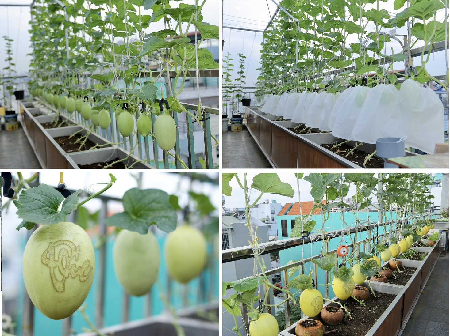 Đây là vườn dưa lưới được gia đình anh Đồng Văn Hồng (SN 1972, phường 11, quận Bình Thạnh, TP.HCM) trồng trên sân thượng.