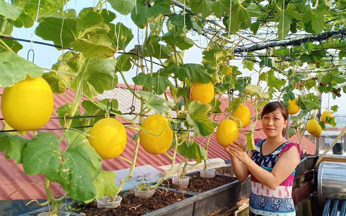 Chị Nguyễn Thị Thương Huyền, 38 tuổi ở Thanh Trì Hà Nội bắt đầu trồng các loại dưa như dưa lê, dưa bở, dưa lưới... trên sân thượng từ 2017. Với 30 m2 sân thượng có thể đặt được 70 thùng trồng dưa, mỗi lần thu vài chục trái.