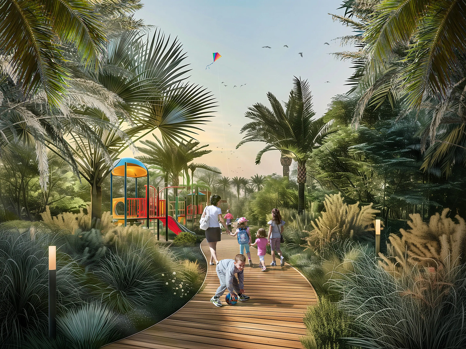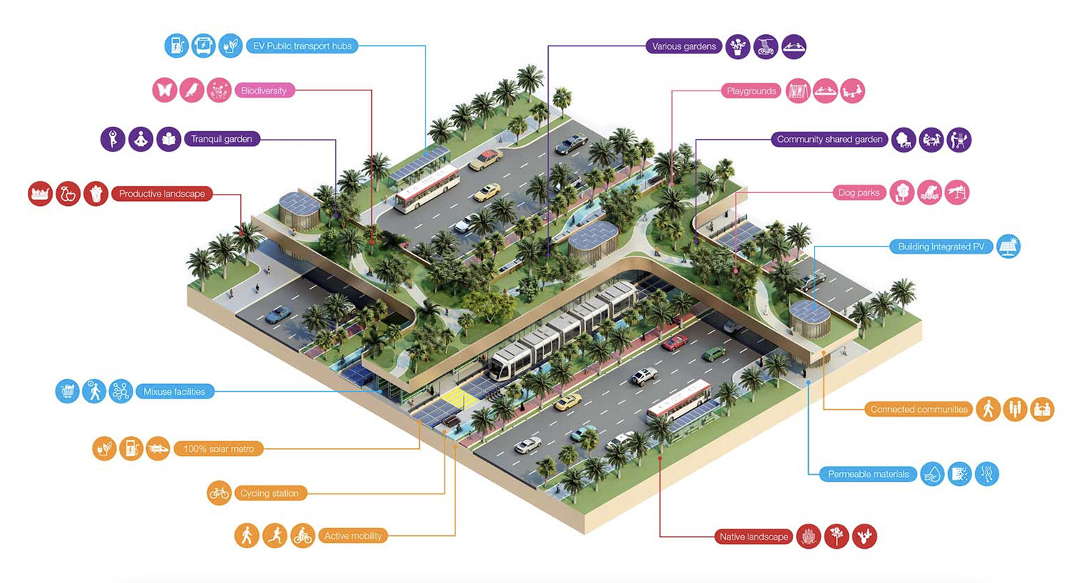 Hàng triệu cây xanh sẽ được trồng tại các công viên, vườn và trang trại đô thị để sản xuất trái cây và rau quả. Các rãnh thoát nước sinh học sẽ được lắp đặt để thu nước, quản lý nước mưa và nước xám. Nước đang là một vấn đề nóng tại Dubai sau trận ngập lụt lịch sử mới đây.