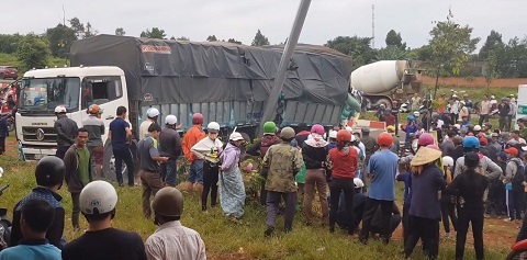 Trong khi đang dừng đèn đỏ, nhiều xe máy, ô tô bị xe tải húc từ phía sau khiến 2 người bị thương, nhiều xe hư hỏng nặng.