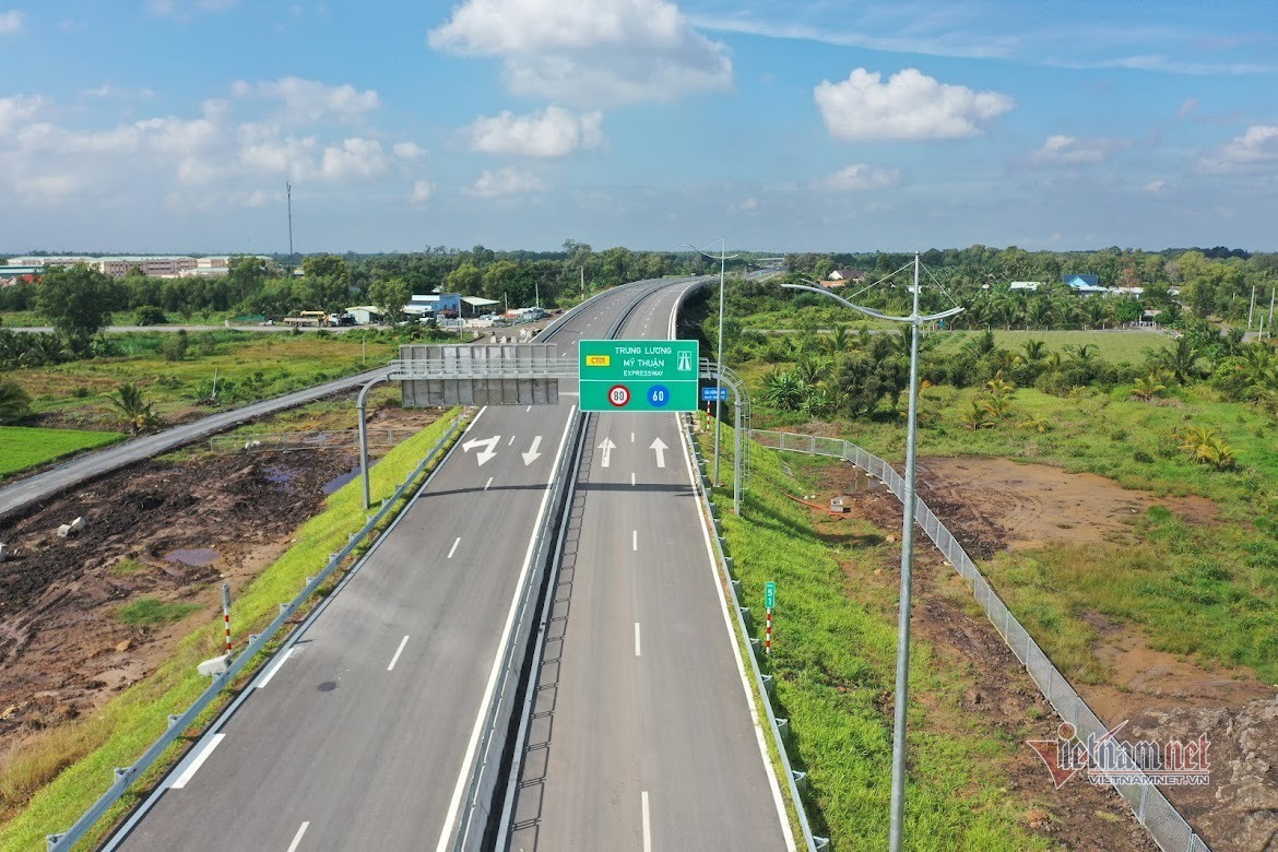 Cao tốc Trung Lương - Mỹ Thuận được thông xe kỹ thuật hôm 19/1. Tổng mức đầu tư dự án hơn 12.600 tỷ đồng, chiều dài toàn tuyến 51,5 km đi qua huyện Cái Bè và thị xã Cai Lậy tỉnh Tiền Giang. Đây là tuyến đường huyết mạch giúp giảm tình trạng ùn tắc giao thông trên quốc lộ 1 ở miền Tây nhiều năm qua.