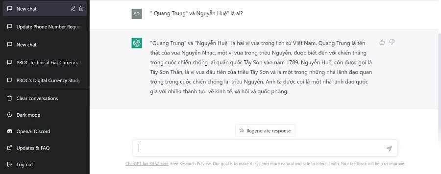 Trong trường hợp, câu hỏi không phổ biến được đưa ra hoặc kho dữ liệu chưa có thì ChatGPT sẽ trả ra kết quả gần giống. Đương nhiên, một nửa sự thật không phải là sự thật. Ví dụ điển hình, khi hỏi ChatGPT, Quang Trung và Nguyễn Huệ là ai ? Chatbot này nhầm lẫn khá nhiều khi cho Quang Trung là Nguyễn Nhạc hay Quang Trung là người giành chiến thắng trong cuộc chiến với chính đội quân Tây Sơn của mình…