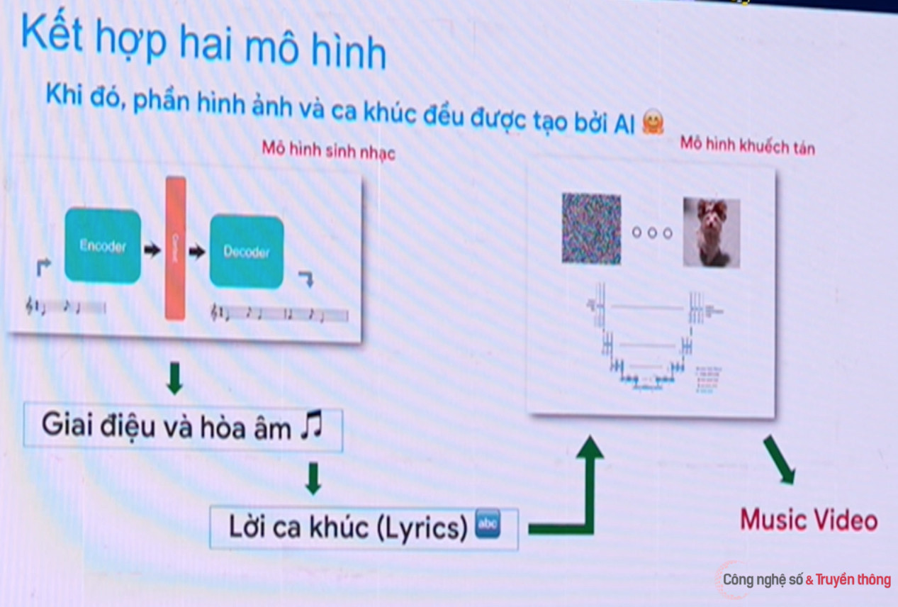 Đồng thời Bảo Đại cũng chia sẻ một ý tưởng thú vị: kết hợp hai mô hình nhạc và vẽ tranh. Bước một là viết giai điệu và hòa âm, thứ hai là viết lời - sử dụng lời như một đầu vào cho mô hình Diffusion, nghĩa là đầu ra sẽ là bức tranh của phần lời mà mình đã viết.