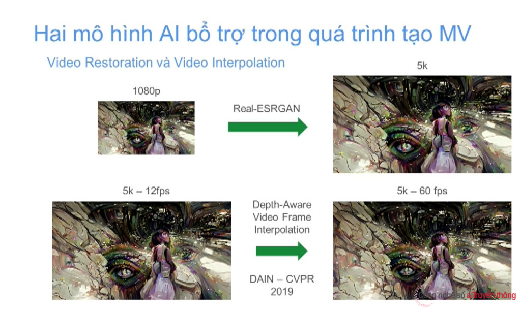 Ngay sau đó, nhạc sỹ, kỹ sư này đã trình diễn thực tế quá trình tạo ra video âm nhạc bằng AI. Sau khi biểu diễn, anh phân tích những bức tranh trong đoạn video mang tên "Hướng nội". Những biểu tượng ngôi sao, ánh sáng ngày đêm, ánh mắt... đều được AI sử dụng để vẽ thành bức tranh ấn tượng. AI còn giúp tối ưu hình ảnh đạt chất lượng 5K, tăng tần số quét lên 60 fps.