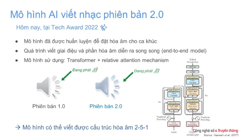 Theo Nguyễn Hoàng Bảo Đại, năm nay mô hình đã nâng cấp lên 2.0, có thể viết hòa âm song song giai điệu. Kỹ sư sinh năm 1994 cũng trình diễn hai phiên bản giai điệu: 1.0 vào năm 2020 và 2.0. Đại lý giải, mô hình năm nay có thể viết được cấu trúc hòa âm 2-5-1. Số 2 là Rê thứ, 5 là Sol 7, 1 là đô trưởng. Đây là cấu trúc cơ bản trong nhạc lý và mô hình năm nay có thể này bắt được, tạo ra bản hòa âm ấn tượng hơn.
