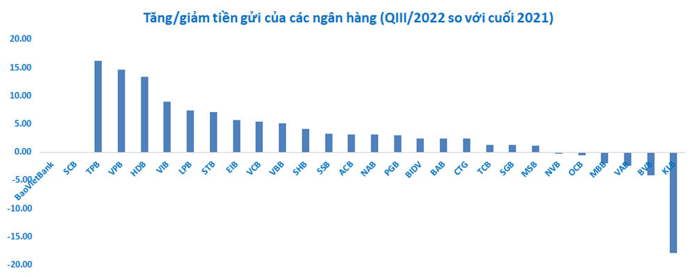 Thống kê cho thấy, tới cuối quý III/2022, 26 ngân hàng trên sàn chứng khoán (không bao gồm Agribank, BaoVietBank và SCB) có tổng lượng tiền huy động từ các tổ chức và cá nhân đạt hơn 7,718 triệu tỷ đồng, tăng 4,01% so với cuối năm 2021.