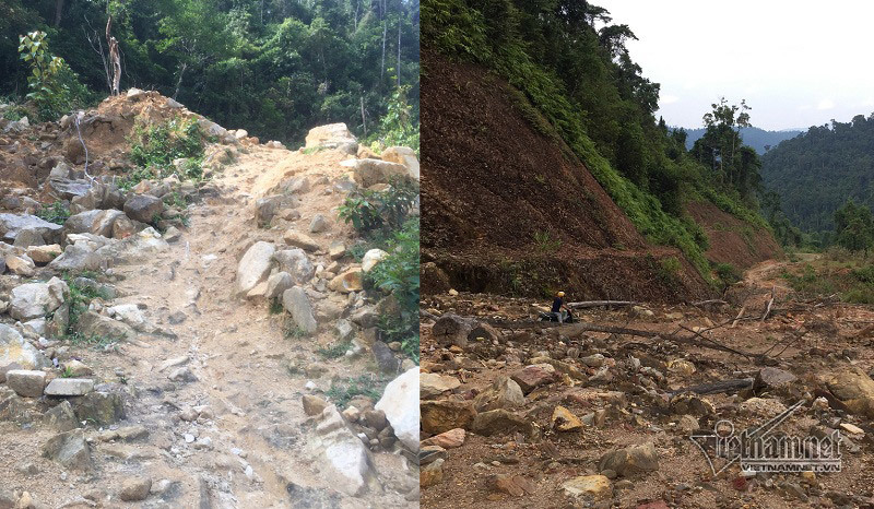Hai bên đường, hàng loạt vách núi sau khi đơn vị thi công bạt taluy đã bị sạt lở, sụt lún. Suốt chiều dài khoảng 20km, mặt đường không có một điểm bằng phẳng, đầy những tảng đá gồ ghề nằm rải rác. Một số đoạn, nước lũ từ trên các sườn núi tràn xuống, cuốn phăng đất đá khiến đường bị xẻ làm đôi.