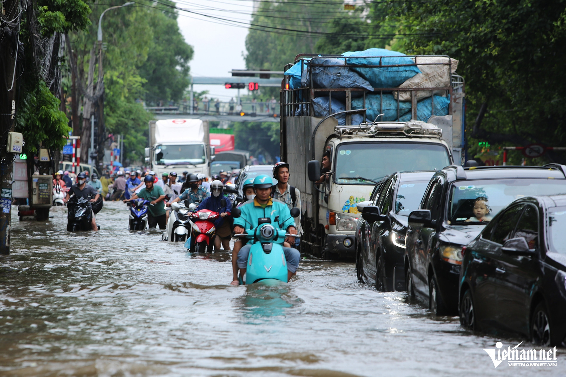 Đoạn ngập sâu nhất tại đây hơn 50cm, các phương tiện không thể lưu thông. Nhiều người đã chọn cách dắt bộ qua đoạn ngập để đi tiếp.
