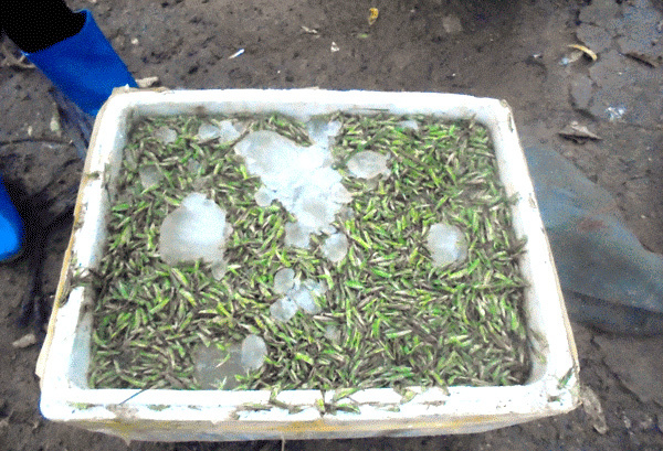 Châu chấu được ướp lạnh được đựng trong thùng xốp. |