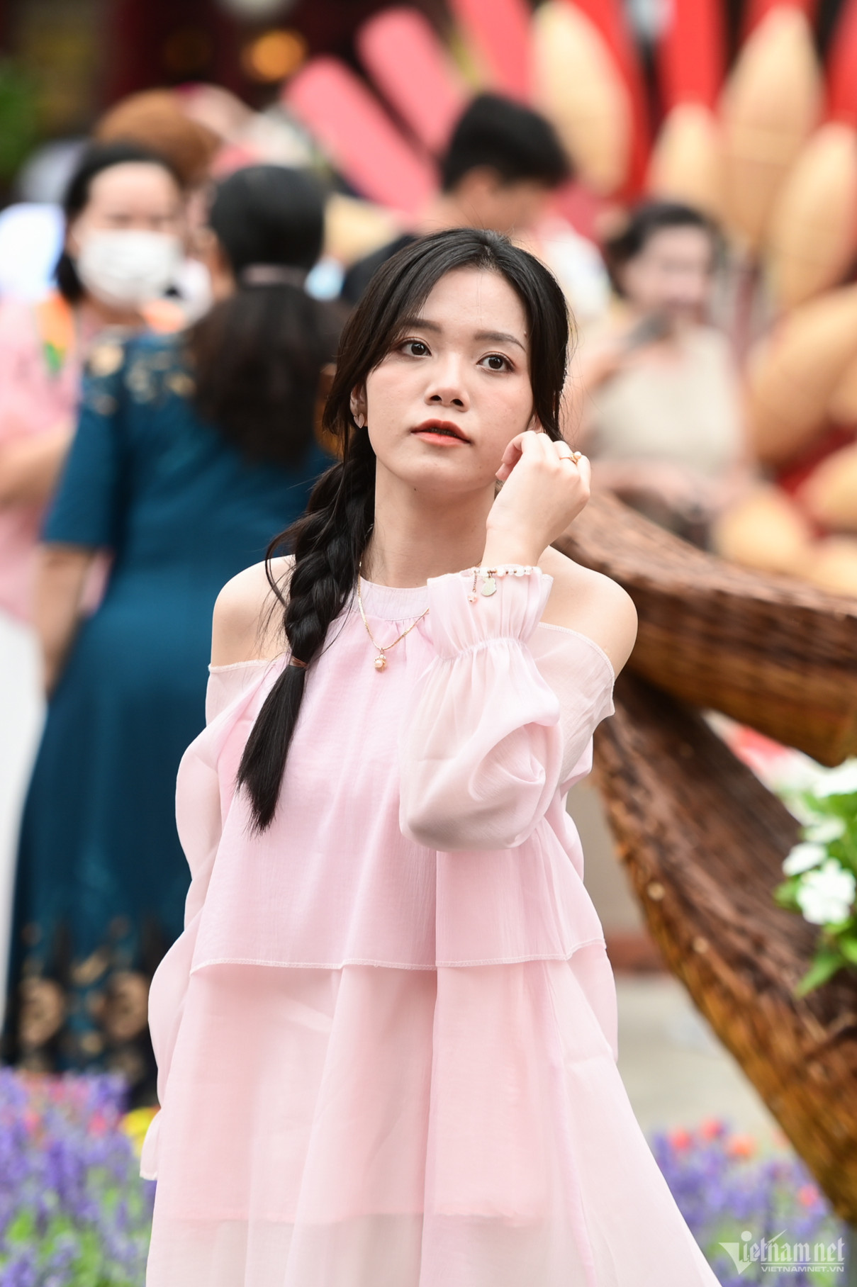 Những bộ váy thướt tha, những chiếc áo dài đủ màu sắc cùng phụ kiện hoa lá được nhiều du khách diện lên. "Mùa xuân trăm hoa đua nở, sẽ thật tuyệt nên được cùng người thân và bạn bè lưu giữ lại những khoảnh khắc đáng nhớ này", Quỳnh Như (quận Bình Thạnh) chia sẻ.
