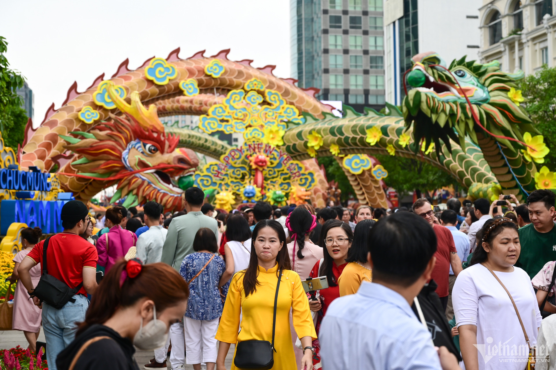 Với chủ đề “Xuân yêu thương, Tết sum vầy”, điểm nhấn của đường hoa Nguyễn Huệ dịp Tết Giáp Thìn là hình ảnh linh vật rồng được cách điệu với dáng bay lên trời, thể hiện khát vọng vươn lên trong bối cảnh hội nhập sâu rộng của cả nước cũng như thành phố.
