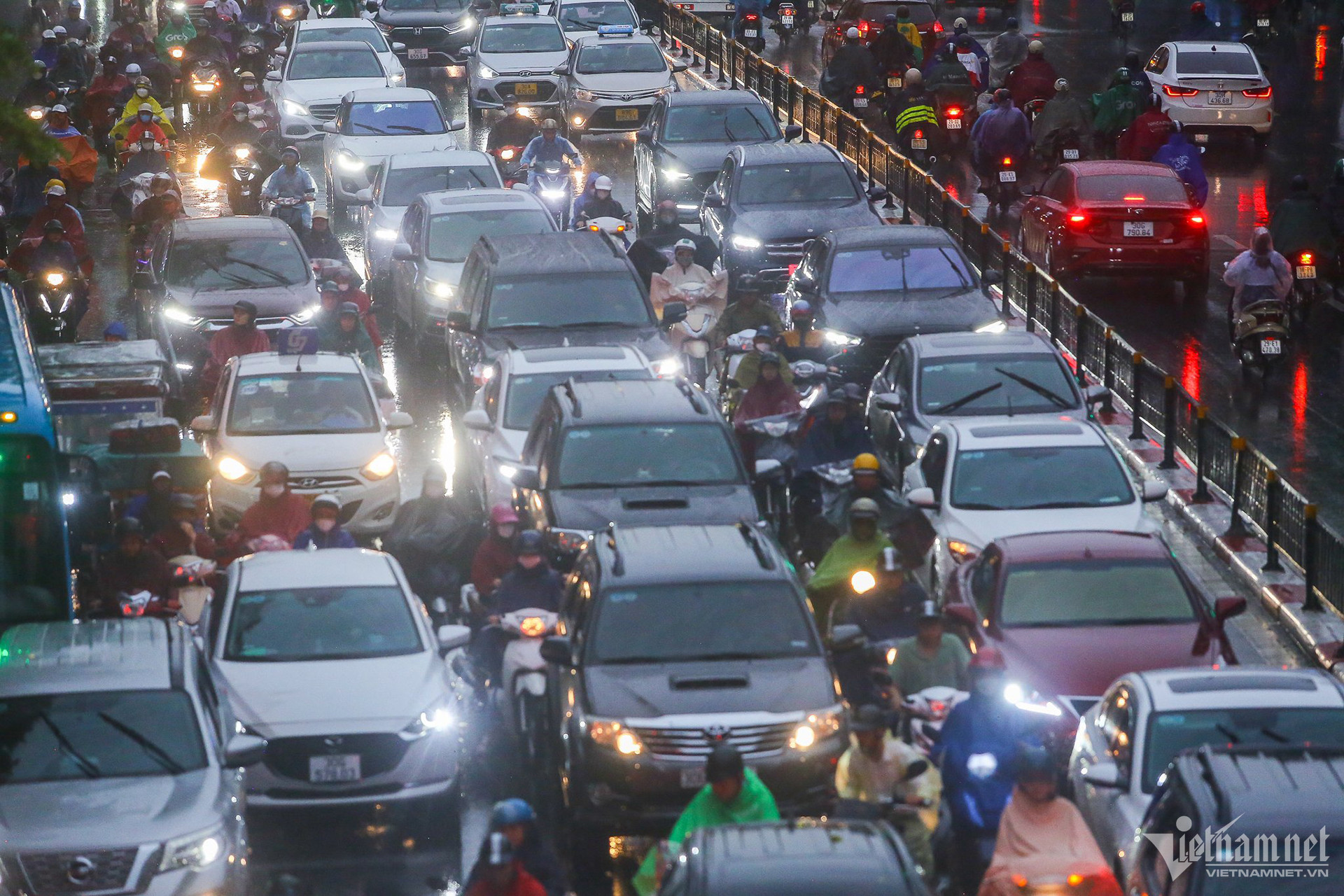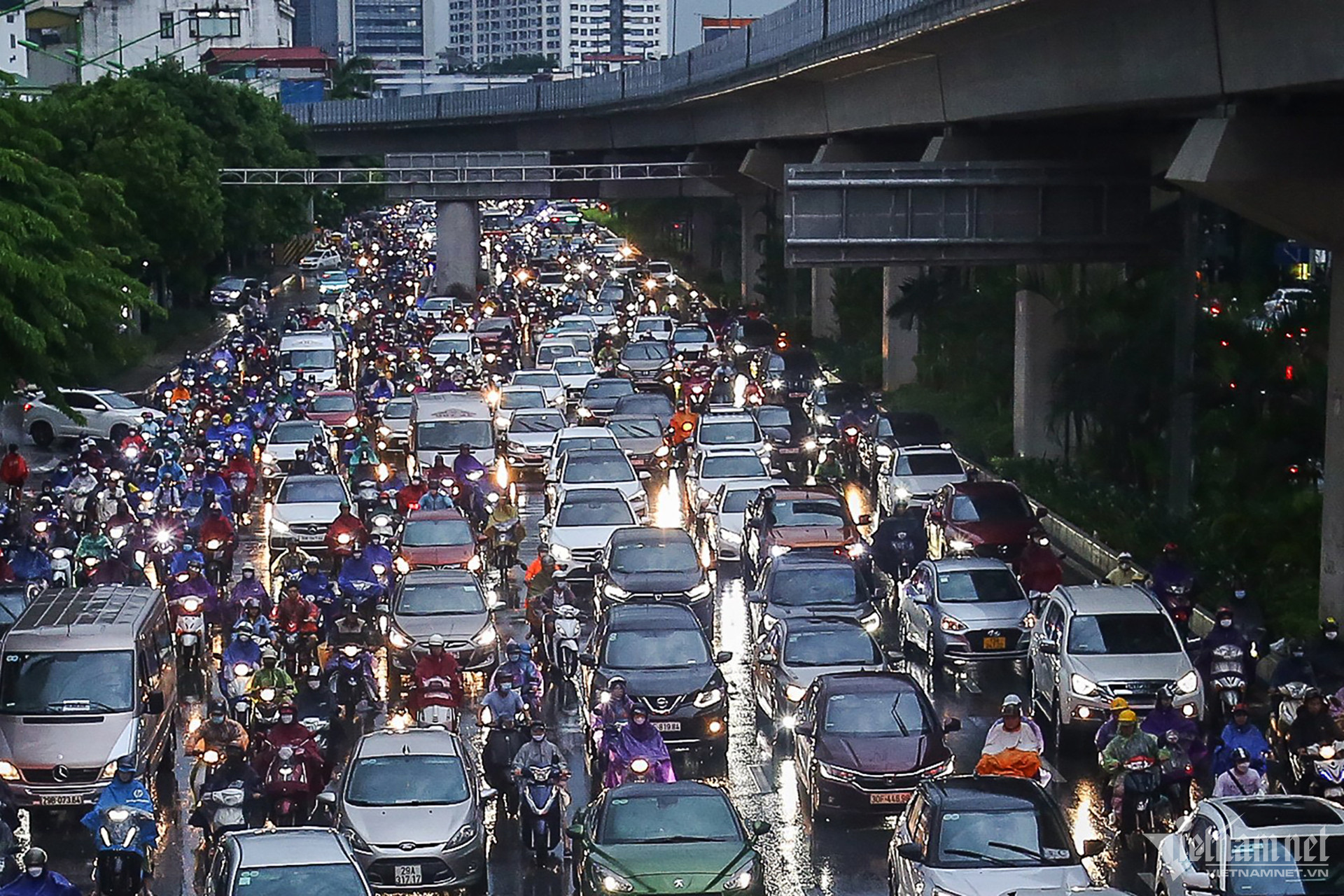 Ghi nhận tại tuyến đường Tây Sơn - Nguyễn Trãi, hướng từ quận Đống Đa về Hà Đông, các phương tiện phải "đội mưa", nhích từng mét để di chuyển.