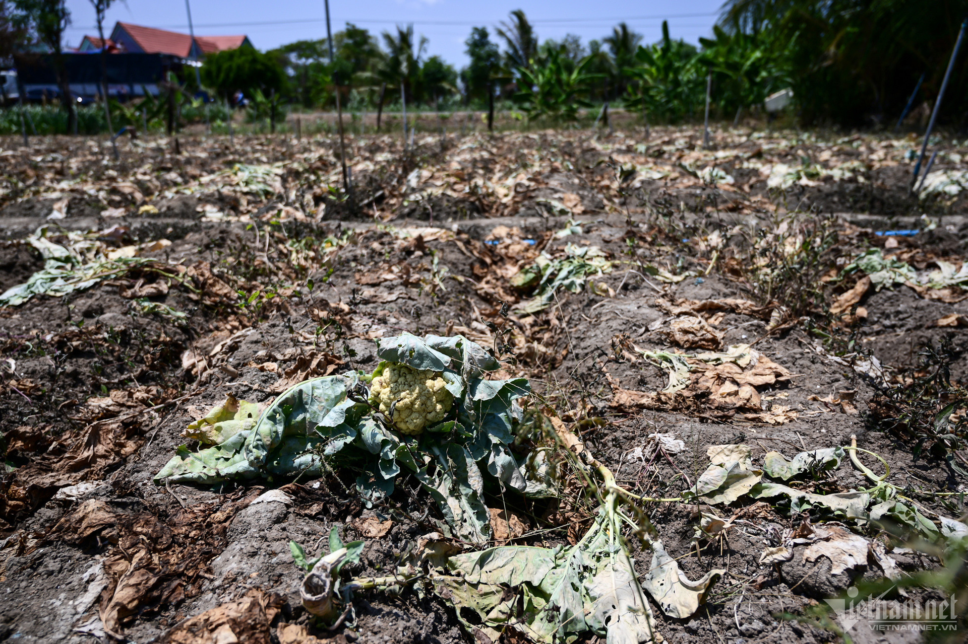 Ruộng bông cải trắng rộng 4.000m2 của ông Nguyễn Văn Tùng (huyện Gò Công Đông) bị chết khô do thiếu nước ngọt tưới tiêu, ước tính thiệt hại cả chục triệu đồng.