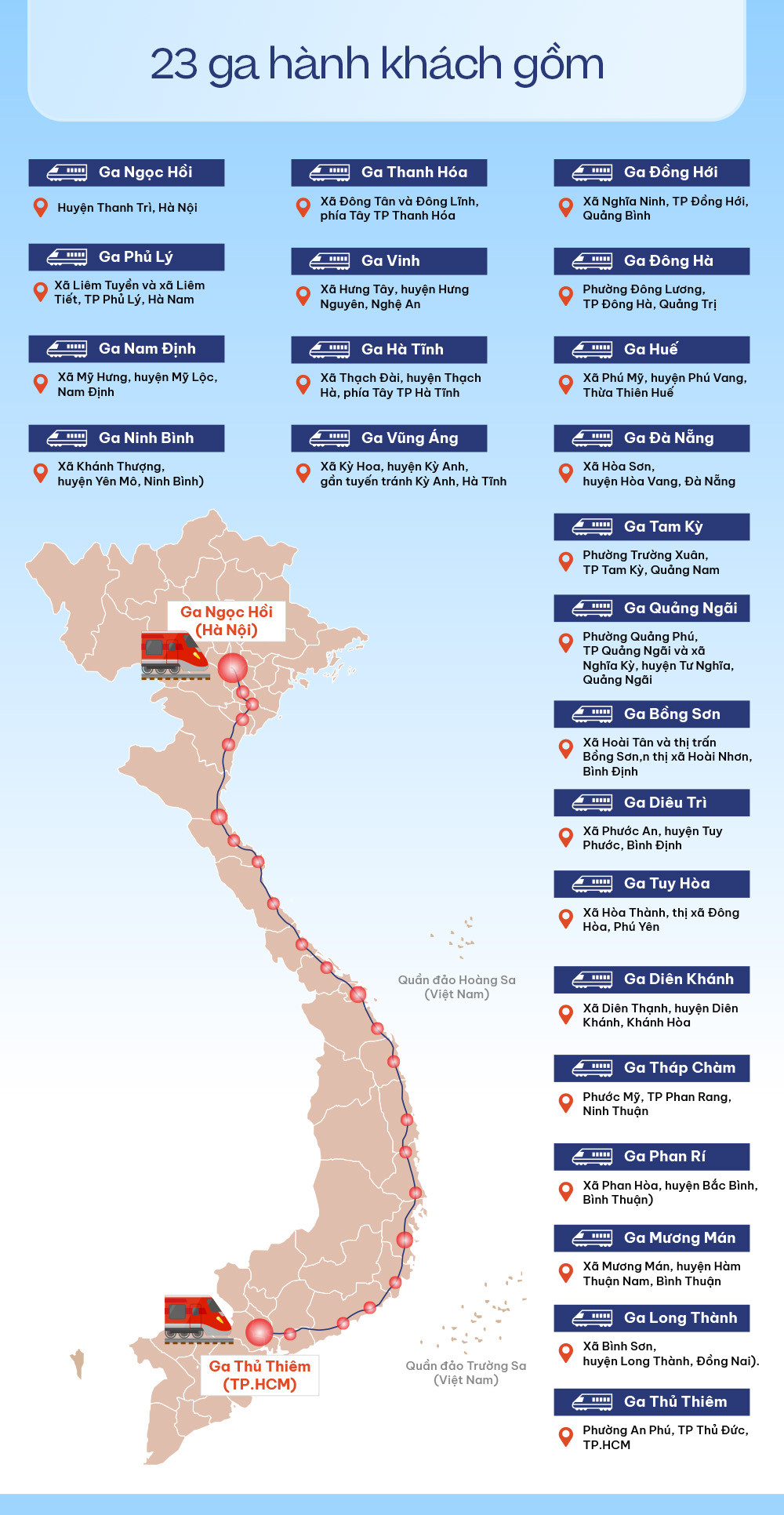 Trên toàn tuyến sẽ được bố trí 23 ga hành khách với cự ly trung bình từ 50 - 70km, 5 ga hàng gắn với các đầu mối hàng hóa, phục vụ tốt hậu cần quốc phòng khi có nhu cầu.