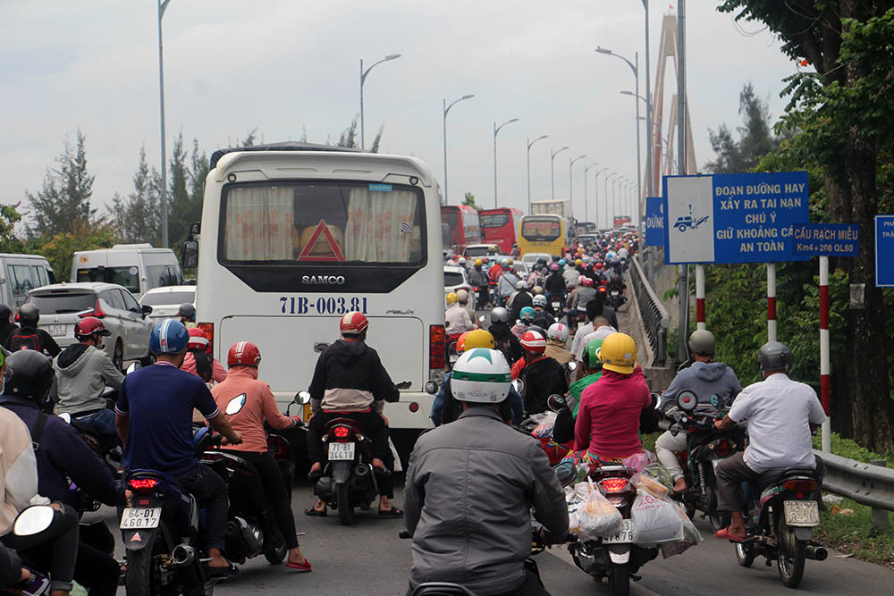 Dù đã có bến phà “chia lửa”, nhưng cầu Rạch Miễu vẫn bị quá tải. Hàng nghìn phương tiện ken cứng, chôn chân tại chỗ gần 1h, hướng từ Tiền Giang đi Bến Tre.