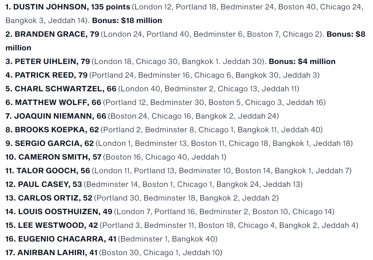 Dustin Johnson có 14 điểm trong cuộc đua tại Jeddah, nâng thành tích toàn mùa giải lên 135 điểm.