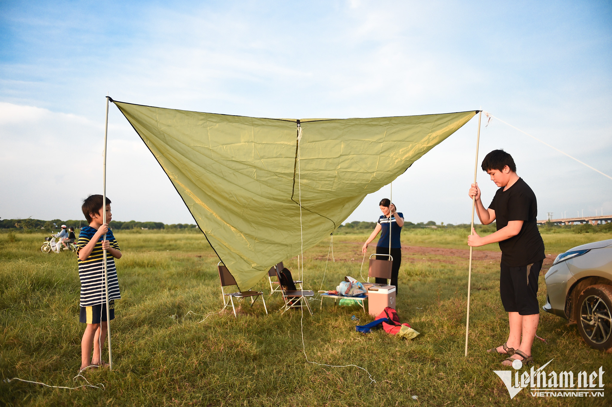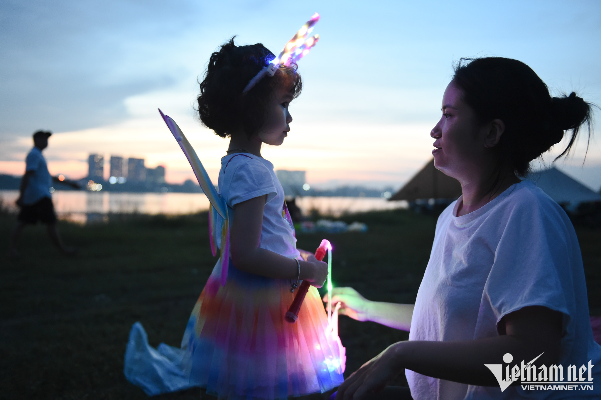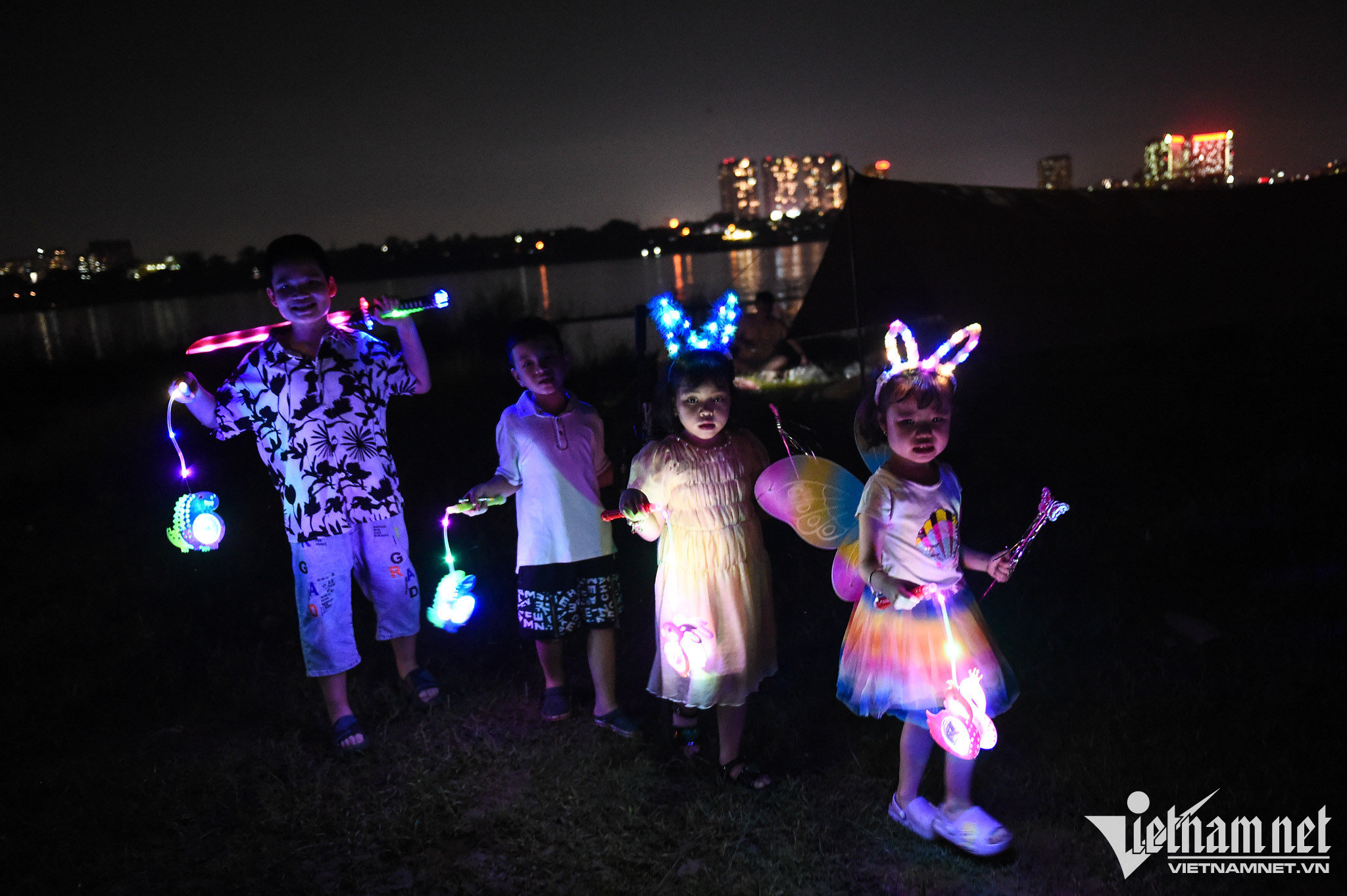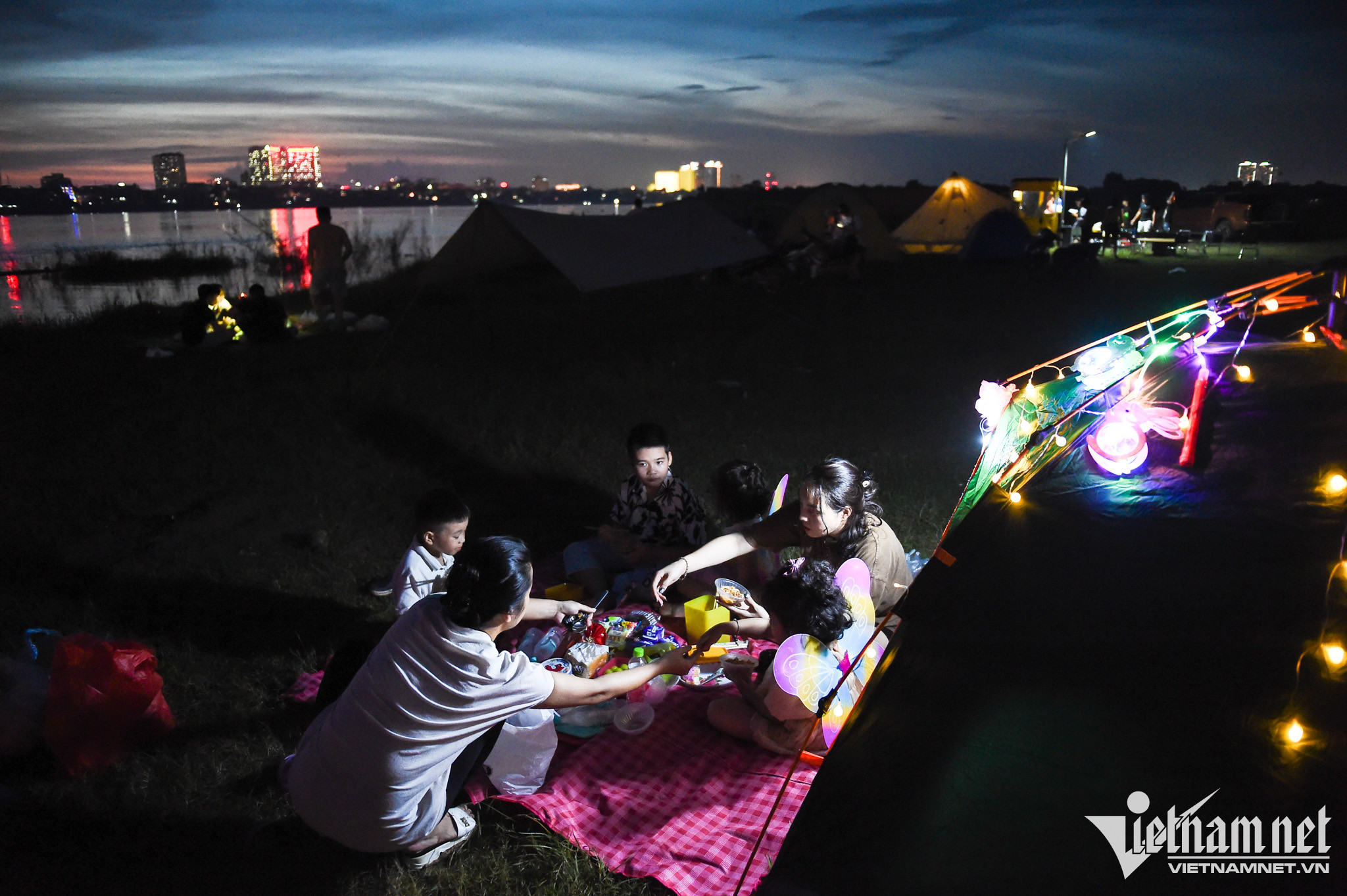 Hai chị em Sứa và Mầm theo bố mẹ ra bãi sông đón Trung thu. Các bé mang theo đèn lồng, váy áo xúng xính để chuẩn bị rước đèn."Nhìn cảnh trung thu đông đúc trên phố mọi năm, gia đình tôi chẳng dám đi nữa, bèn rủ nhau mang đồ ra sông cắm trại. Ở đây ngắm trăng và về muộn một chút cũng được, miễn sao các con có không gian để thỏa thích chơi đùa", mẹ bé Mầm nói.Gia đình nhà bé Mầm và Sứa chọn vị trí gần bờ nước để được tận hưởng làn gió mát rồi cùng nhau phá cỗ. Điều bất tiện duy nhất là khu vực này không có điện. Họ phải mang theo đèn pin và trang trí lều bằng dây nhấp nháy.20h, sau khi dùng xong bữa tối, đám trẻ nối đuôi nhau rước đèn trung thu.Một vài nhóm bạn khác cũng chuẩn bị bếp lửa để nướng đồ ăn tối.Nhóm bạn 12 người làm cùng một công ty rủ nhau đi cắm trại nhân dịp tết Trung thu. "Ăn uống xong cả nhóm sẽ ngồi ngắm trăng rằm, đàn hát. Chúng em sẽ ngủ luôn tại đây, sáng mai về vì là ngày chủ nhật được nghỉ", Bế Thị Hương, một thành viên chia sẻ.20h30, nhiều người tiếp tục đổ về khu vực bãi bồi ven sông Hồng mặc cho con đường bị sình lầy bởi mưa và trời khá tối, xung quanh không có đèn điện.