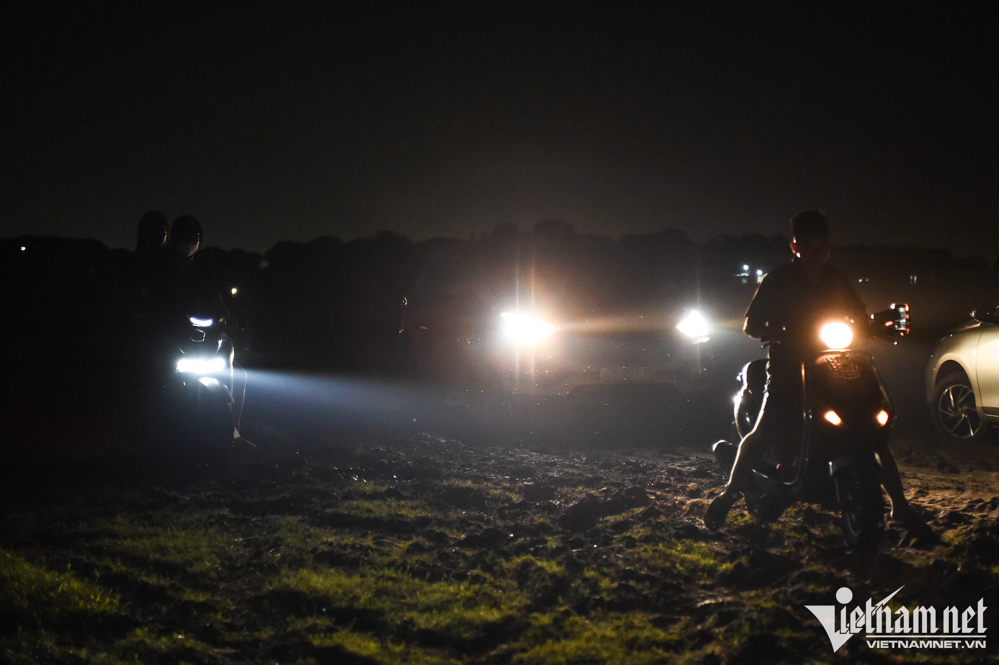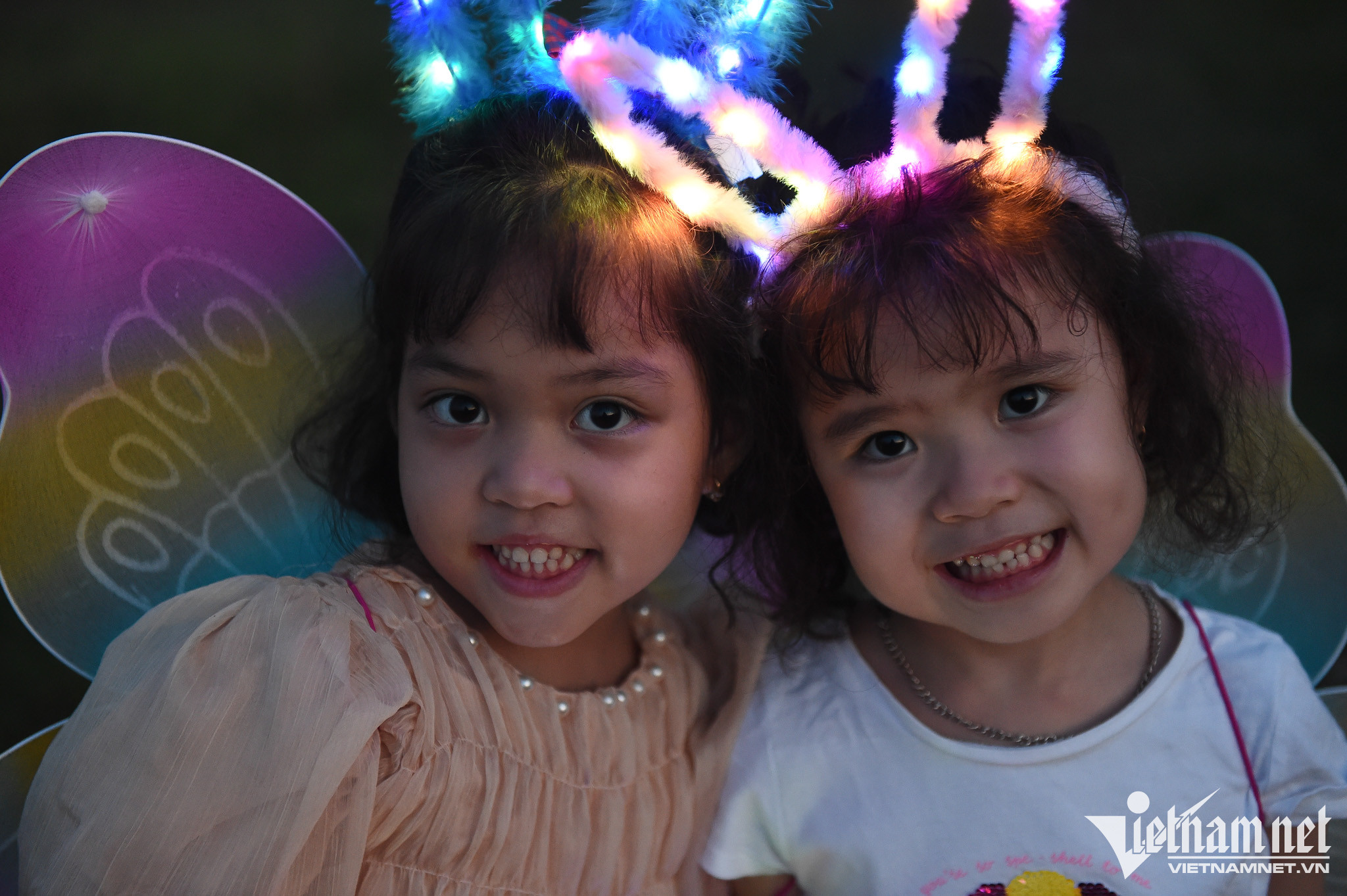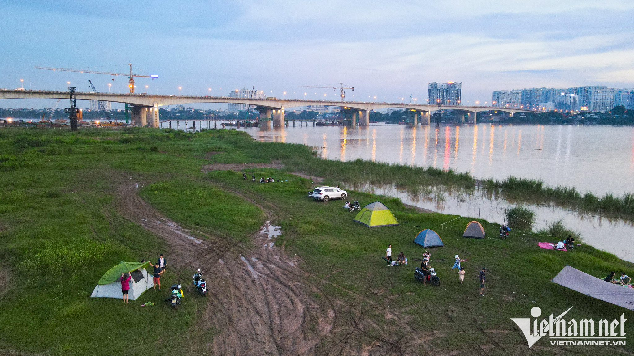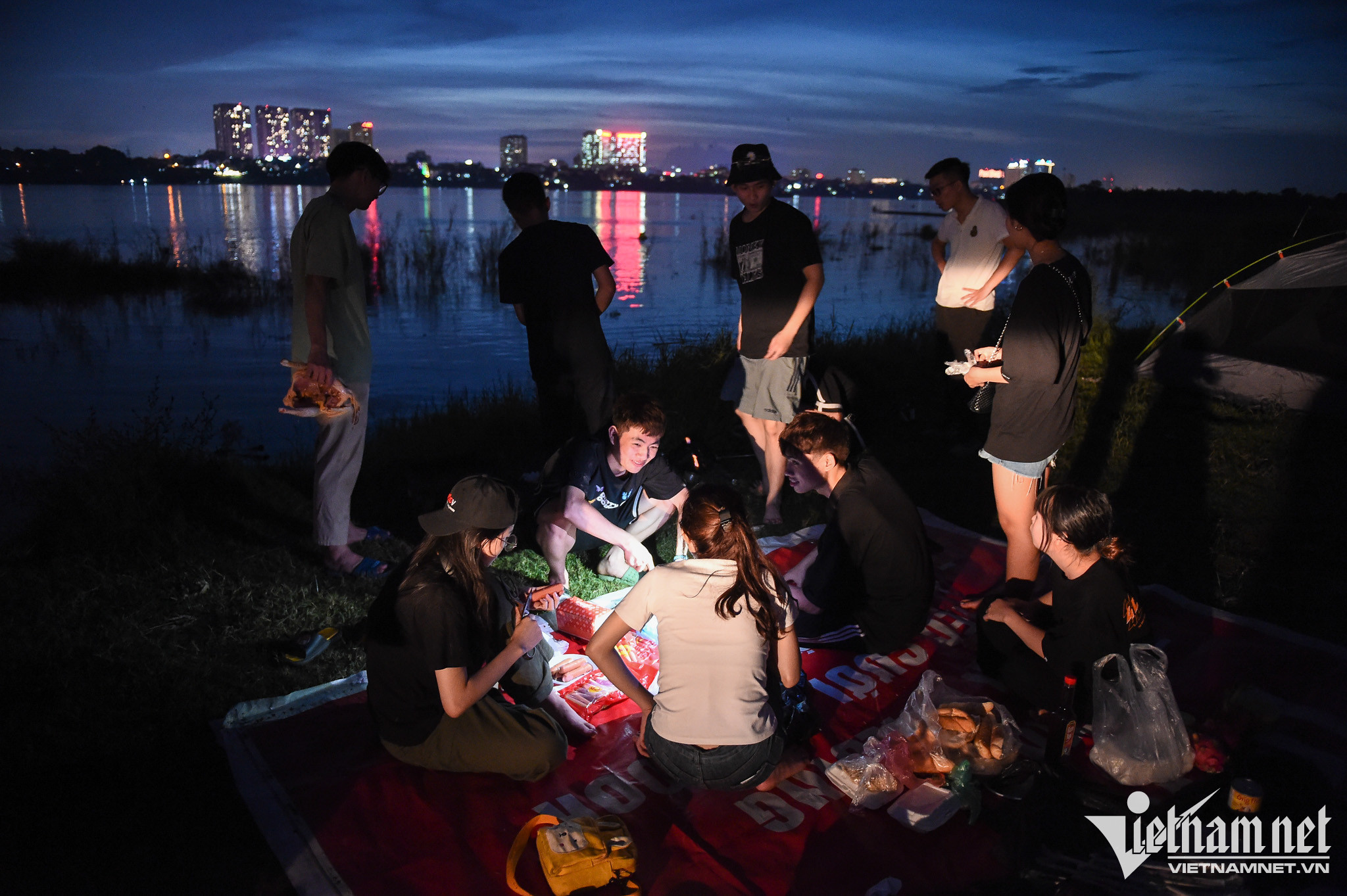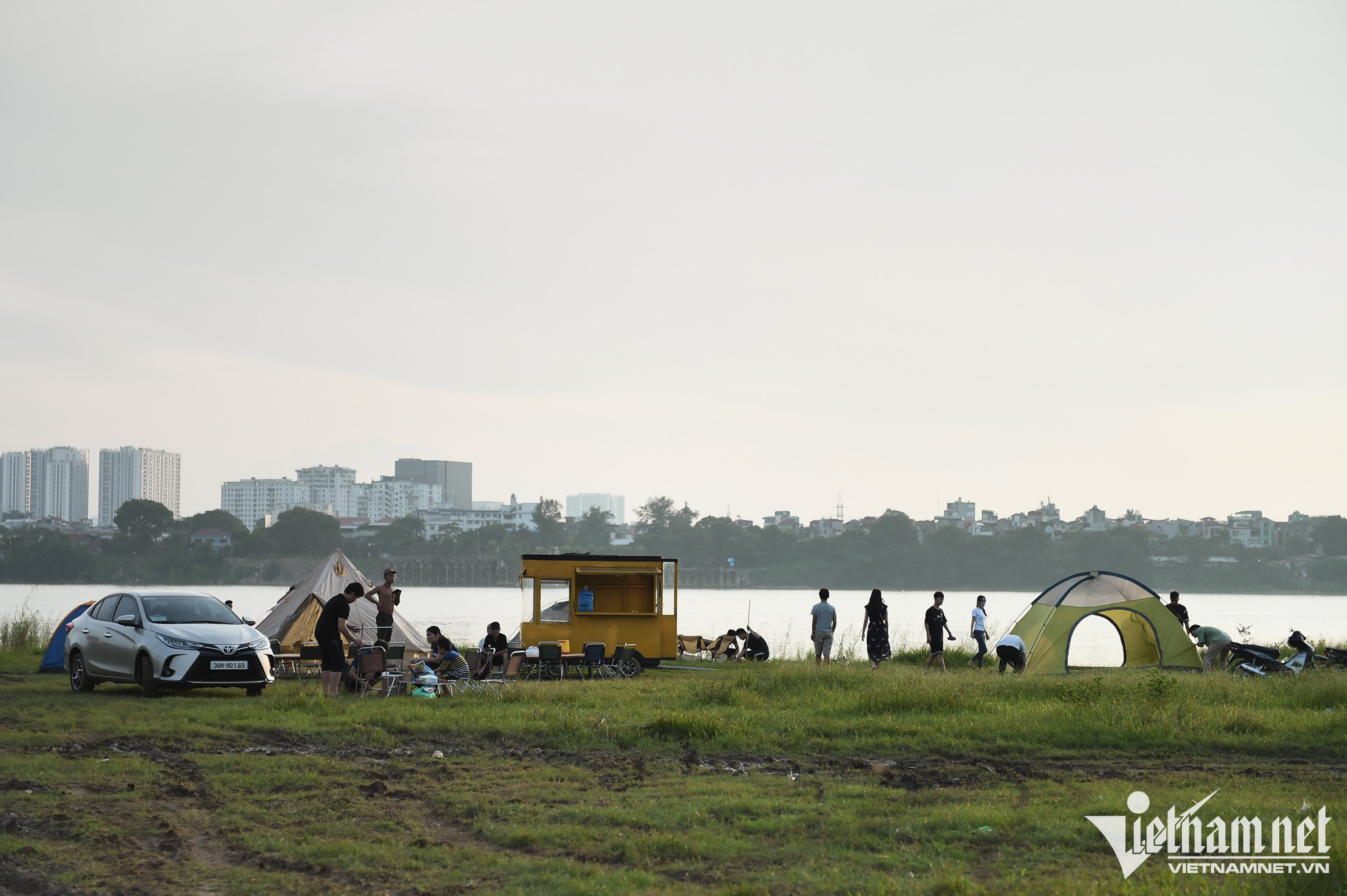 Hai chị em Sứa và Mầm theo bố mẹ ra bãi sông đón Trung thu. Các bé mang theo đèn lồng, váy áo xúng xính để chuẩn bị rước đèn."Nhìn cảnh trung thu đông đúc trên phố mọi năm, gia đình tôi chẳng dám đi nữa, bèn rủ nhau mang đồ ra sông cắm trại. Ở đây ngắm trăng và về muộn một chút cũng được, miễn sao các con có không gian để thỏa thích chơi đùa", mẹ bé Mầm nói.Gia đình nhà bé Mầm và Sứa chọn vị trí gần bờ nước để được tận hưởng làn gió mát rồi cùng nhau phá cỗ. Điều bất tiện duy nhất là khu vực này không có điện. Họ phải mang theo đèn pin và trang trí lều bằng dây nhấp nháy.20h, sau khi dùng xong bữa tối, đám trẻ nối đuôi nhau rước đèn trung thu.Một vài nhóm bạn khác cũng chuẩn bị bếp lửa để nướng đồ ăn tối.Nhóm bạn 12 người làm cùng một công ty rủ nhau đi cắm trại nhân dịp tết Trung thu. "Ăn uống xong cả nhóm sẽ ngồi ngắm trăng rằm, đàn hát. Chúng em sẽ ngủ luôn tại đây, sáng mai về vì là ngày chủ nhật được nghỉ", Bế Thị Hương, một thành viên chia sẻ.20h30, nhiều người tiếp tục đổ về khu vực bãi bồi ven sông Hồng mặc cho con đường bị sình lầy bởi mưa và trời khá tối, xung quanh không có đèn điện.
