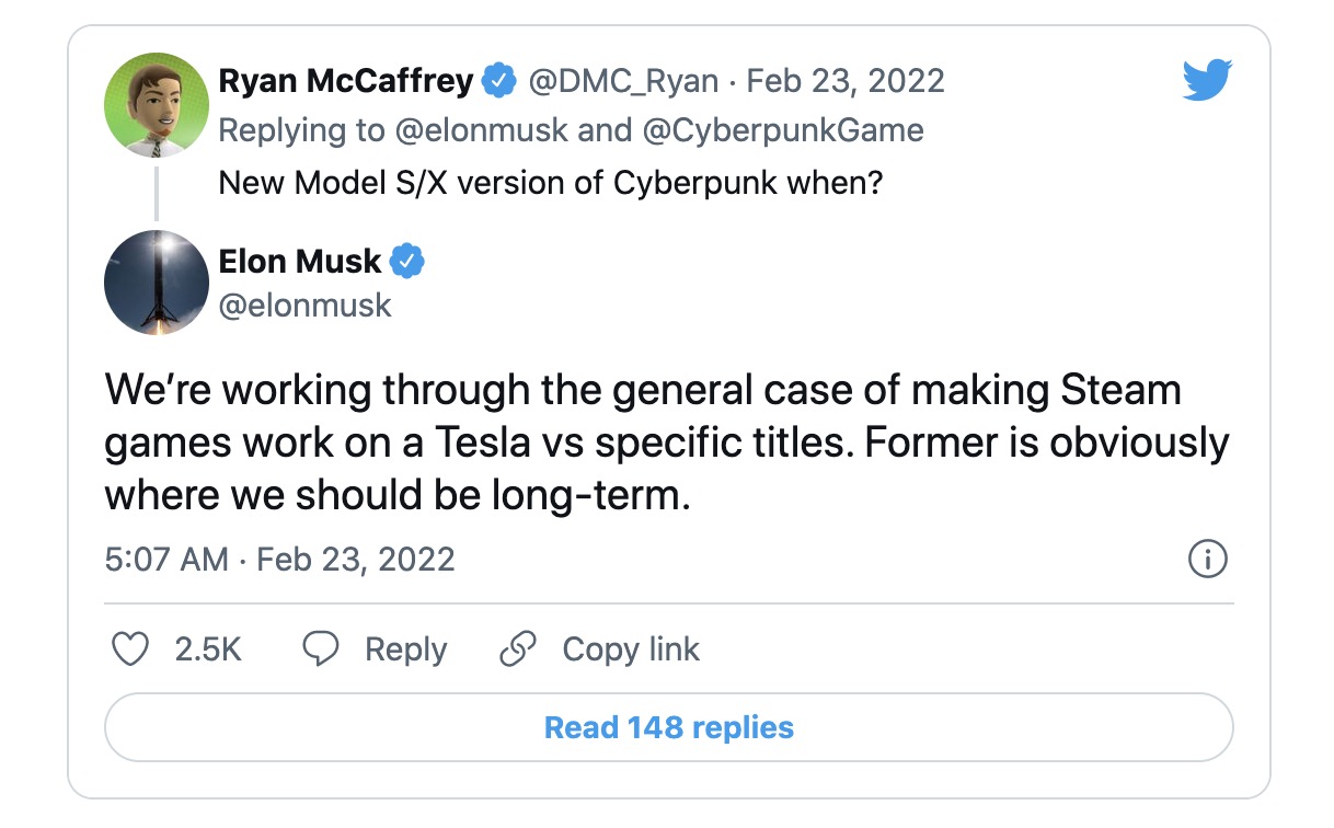 Elon Musk mới đây đã khẳng định rằng công ty đang tìm cách để đưa nền tảng game Steam của PC lên xe Tesla. Trả lời cho tài khoản Cyberpunk 2077 chính thức của CD Projekt Red và Ryan McCaffrey của trang game IGN, Musk nói rằng Tesla đang nghiên cứu để cung cấp các game Steam cho chủ sở hữu Tesla, không chỉ một vài tựa game, mà là toàn bộ thư viện game của Steam.