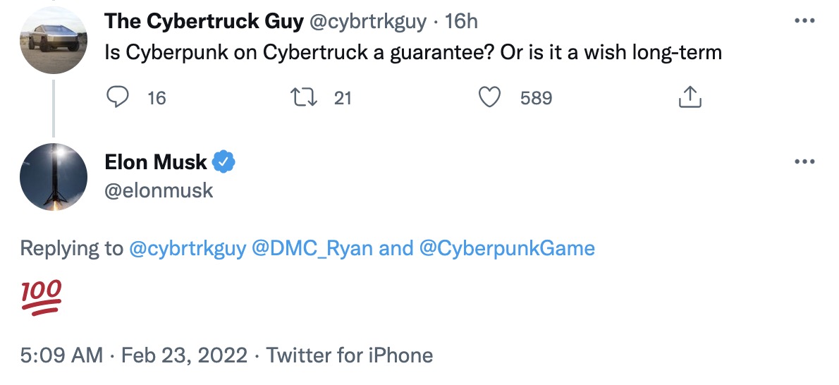 Trong một câu hỏi khác trên Twitter, một người đã hỏi liệu có đảm bảo game Cyberpunk sẽ chơi được trên Cybertruck hay không, Musk trả lời rằng "100%". Elon Musk trước đây đã tuyên bố rằng người dùng sẽ có thể chơi Cyberpunk 2077 và The Witcher 3 trên hệ thống giải trí trong xe, vì vậy điều này cũng không bất ngờ. Tuy nhiên, khả năng tương thích với toàn bộ thư viện Steam thì quả là một tin hấp dẫn.
