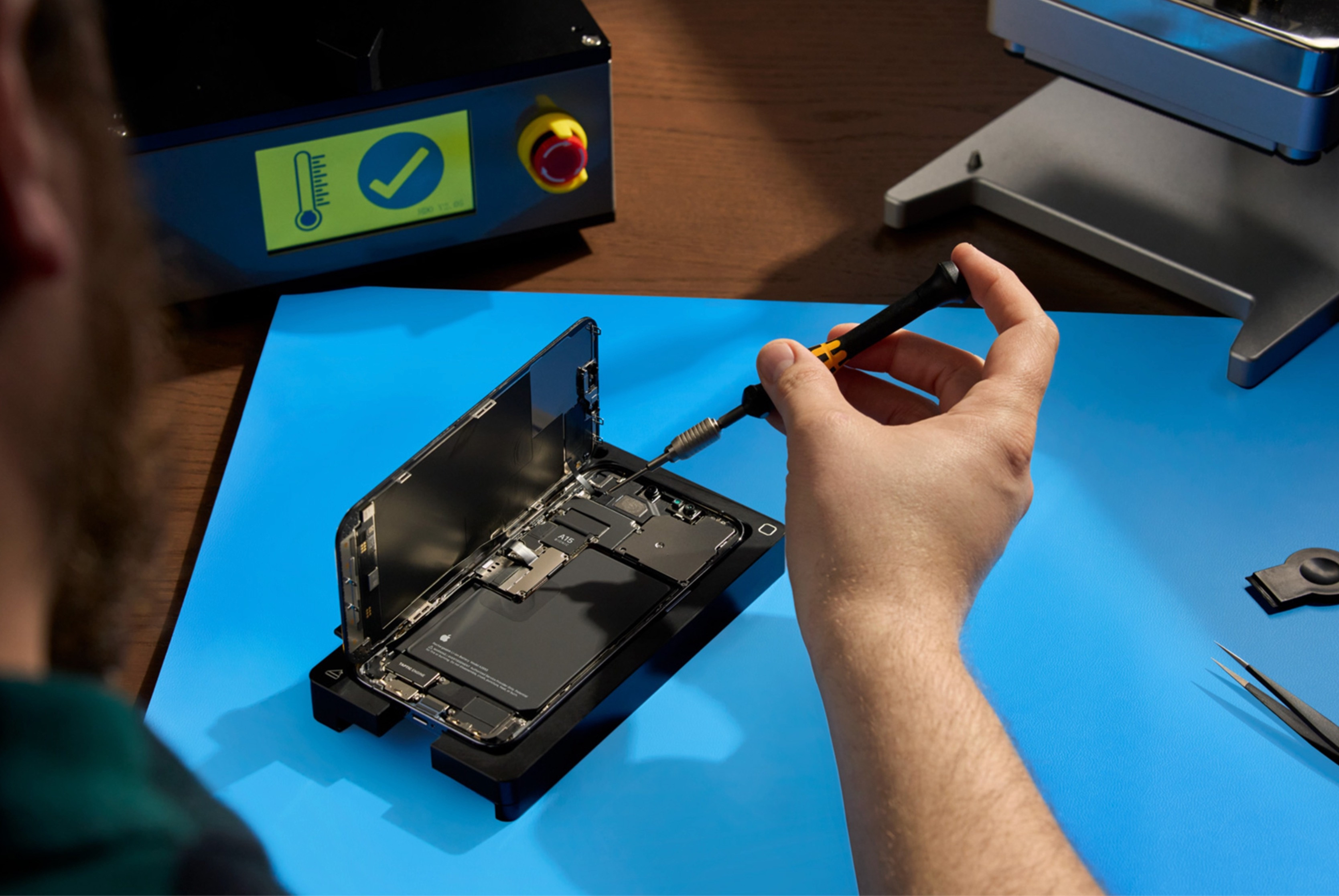 Một chiếc iPhone được tháo màn hình bằng công cụ chuyên dụng để sửa chữa. Ảnh: Apple. |