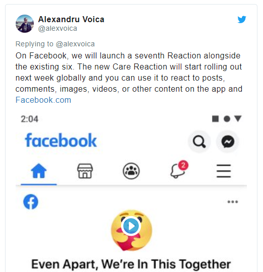 Thay vào đó, với biểu tượng cảm xúc Care mới, người dùng có thể dễ dàng thể hiện sự quan tâm của mình tới người thân, bạn bè, đồng nghiệp ngay trên Facebook và Messenger trực tuyến và không cần tiếp xúc, cũng như không cần sử dụng đến biểu tượng Sad (Buồn) - vốn không phù hợp trong nhiều trường hợp.