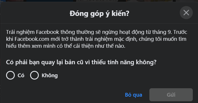 "Trải nghiệm Facebook thông thường sẽ ngừng hoạt động từ tháng 9. Trước khi Facebook.com mới trở thành trải nghiệm mặc định, chúng tôi muốn tìm hiểu thêm xem mình có thể cải thiện như thế nào", Facebook cho biết trong một hộp hội thoại gửi tới những người dùng thử nghiệm bản Facebook Beta trên bản desktop.