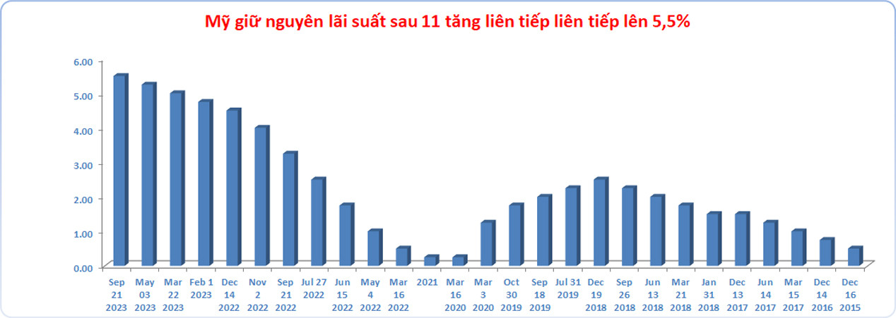 Đây là lần không tăng lãi suất thứ 2 liên tiếp. Trước đó, kể từ tháng 3/2022, Fed đã nâng lãi suất 11 lần liên tiếp lên mức đỉnh 22 năm: 5,25%-5,5%.