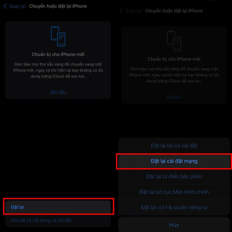 Nếu đã thử hết các cách trên nhưng vẫn không cải thiện được lỗi thì có thể trong quá trình sử dụng đã phát sinh vấn đề gì đó. Bạn hãy thử vào ngay Cài đặt => Cài đặt chung => Chuyển hoặc đặt lại iPhone => Đặt lại => Đặt lại cài đặt mạng để đưa cài đặt SIM về trạng thái ban đầu.