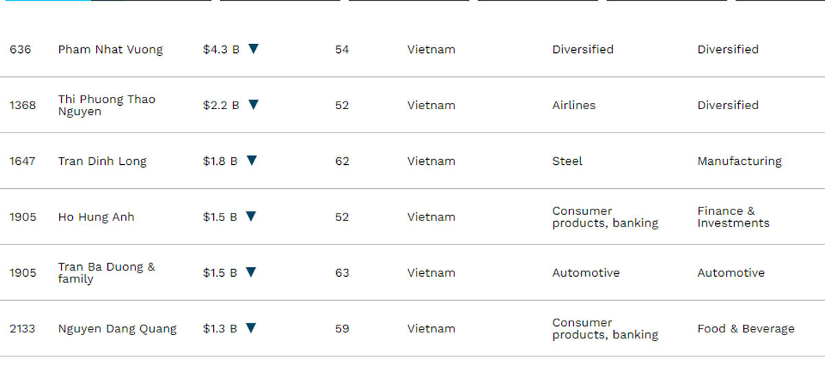 CEO VietJet Air Nguyễn Thị Phương Thảo ở vị trí số 2 với 2,2 tỷ USD. Chủ tịch Hòa Phát Trần Đình Long vươn lên vị trí số 3 với 1,8 tỷ USD, sau một thời gian tụt giảm (và từng rớt khỏi danh sách).