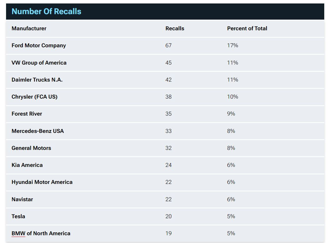 Xếp thứ hai là Volkswagen với 45 vụ thu hồi (chiếm 11%), Daimler Trucks cũng đã triển khai 42 vụ thu hồi, Chrysler (38 vụ) và Forest River - một công ty chuyên sản xuất xe tải thương mại, xe buýt đưa đón… đã triển khai 35 đợt triệu hồi.
