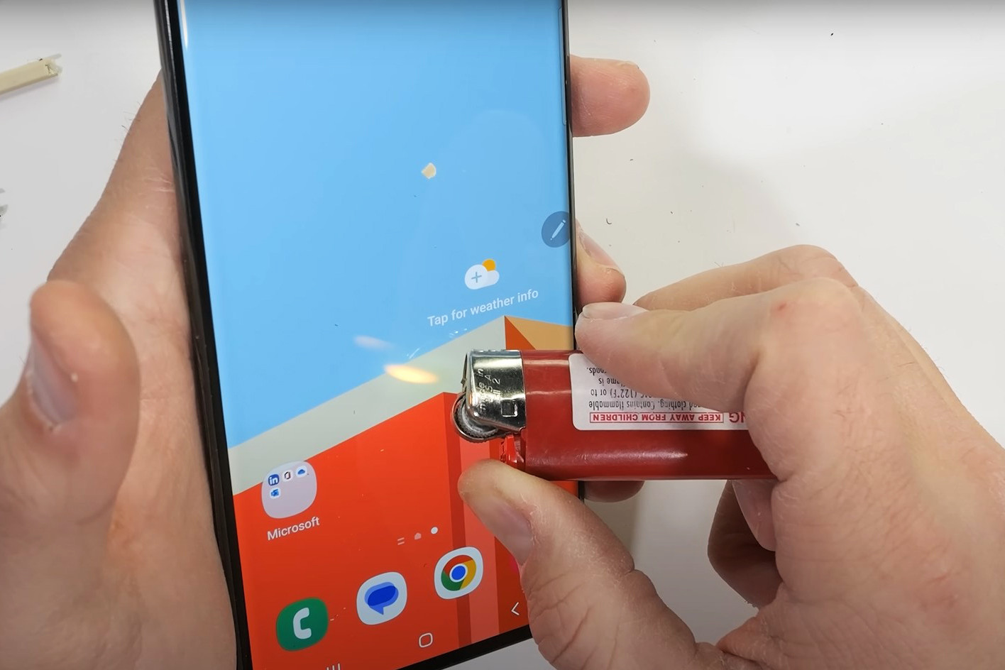 Zack Nelson đã sử dụng bật lửa để hơ nóng tấm nền màn hình Galaxy S23 Ultra trong vòng 60 giây. Tuy nhiên chiếc điện thoại của Samsung dễ dàng vượt qua bài thử thách về nhiệt độ. Các điểm ảnh trên S23 Ultra hiển thị bình thường, không bị ảnh hưởng dù bị hơ nóng bởi lửa trong suốt thời gian dài.