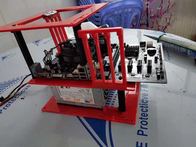 Trước đó, Phong cũng từng dùng các thiết bị có sẵn xung quanh để làm vỏ máy tính. Bộ khung màu đỏ này anh dựng lên để "đào" tiền mã hóa, lắp tới 6 card đồ họa GTX 1060. |