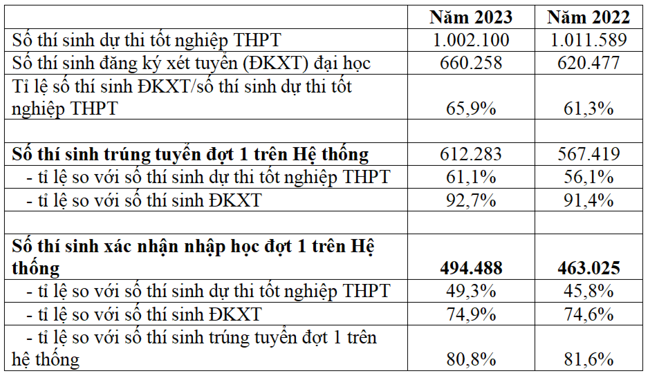Theo đó, số thí sinh trúng tuyển đợt 1 năm 2023 là 612.283 em, tăng gần 45.000 thí sinh so với năm 2022. Con số này nếu so với tổng số thí sinh đăng ký xét tuyển đại học năm nay, chiếm đến 92,7%.