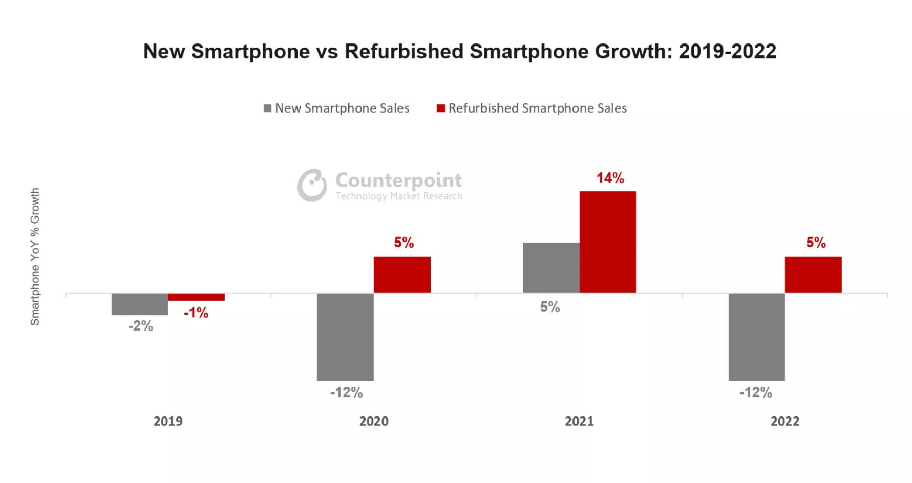 Một yếu tố khác là điện thoại tân trang (refurbished). Doanh số hàng refurbished tăng trưởng 14% trong năm 2021 so với 5% của hàng mới. Khác biệt càng rõ rệt hơn trong năm 2022 với tỷ lệ tương ứng 5% và -12%.