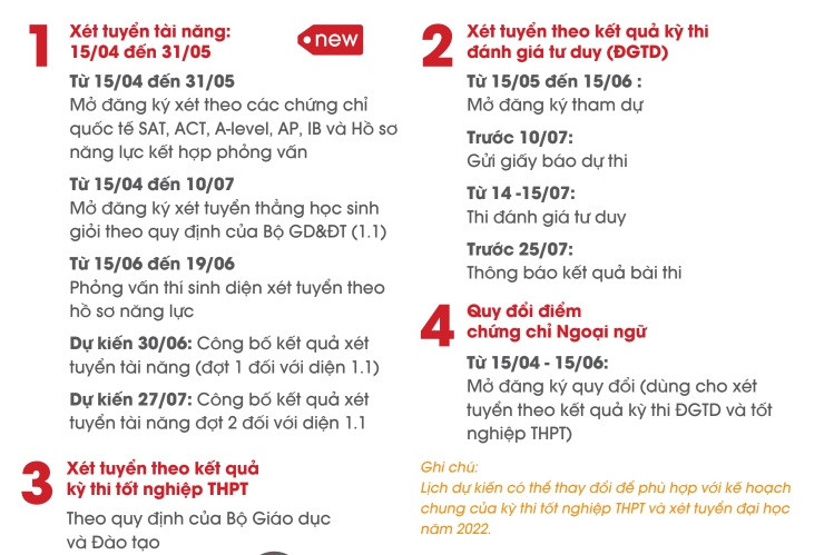 Lịch xét tuyển tài năng và xét tuyển theo kết quả kỳ thi đánh giá tư duy Đại học Bách khoa Hà Nội như sau: