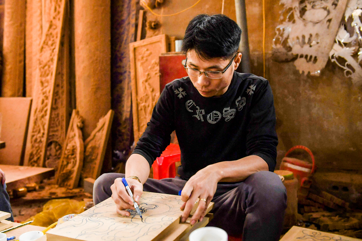 Theo anh Chung, để làm ra một bộ sản phẩm phải trải qua nhiều công đoạn như xẻ gỗ, pha gỗ, vẽ phác thảo, đục, phơi sơn…