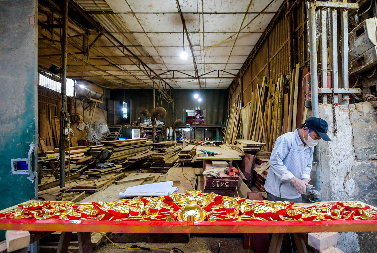 Ngay từ tháng 10 âm lịch, cơ sở sản xuất đồ thờ do anh Vũ Đình Chung làm chủ đã hoạt động nhộn nhịp hẳn lên. Máy móc chạy liên tục, nhiều lao động làm việc không ngơi tay, tăng ca đến tận đêm, chia về các hộ nhỏ để kịp đơn hàng phục vụ thị trường tết Nguyên đán 2024.