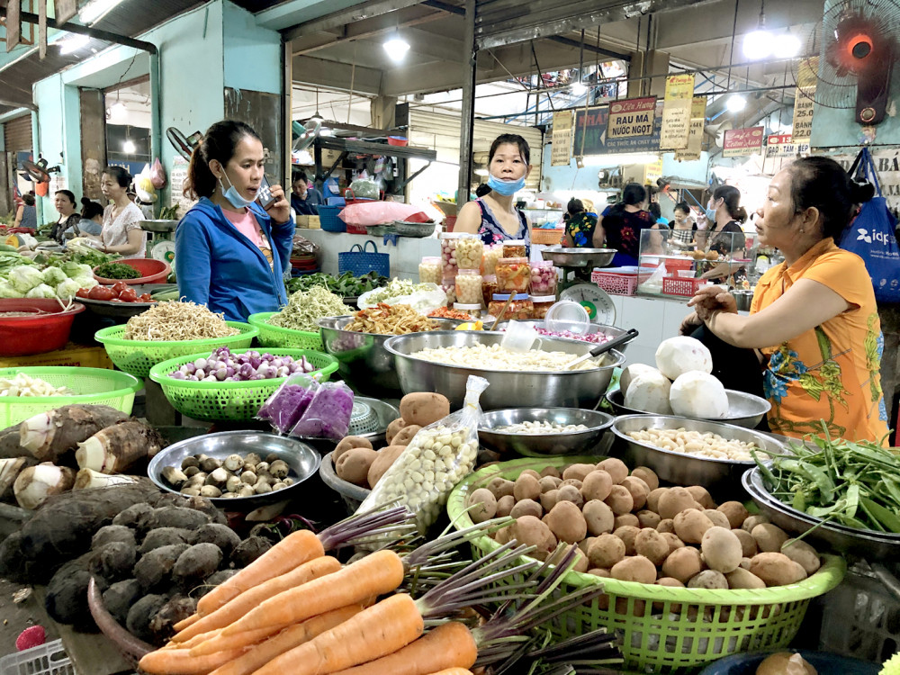 | Các loại rau củ, trái cây có xu hướng tăng giá phổ biến 7-47% so với tháng trước (Trong ảnh: Khách mua thực phẩm tại chợ Hòa Hưng, quận 10) |