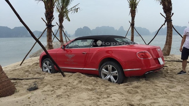 Chiếc xe "demo" Bentley Continental GTC của hãng Bentley Việt Nam bị bắt gặp trong tình trạng mắt kẹt tại bãi cát thuộc khu du lịch Tuần Châu, Hạ Long, Quảng Ninh và phải nhờ đến sự trợ giúp từ một chiếc ô tô khác kéo ra ngoài.