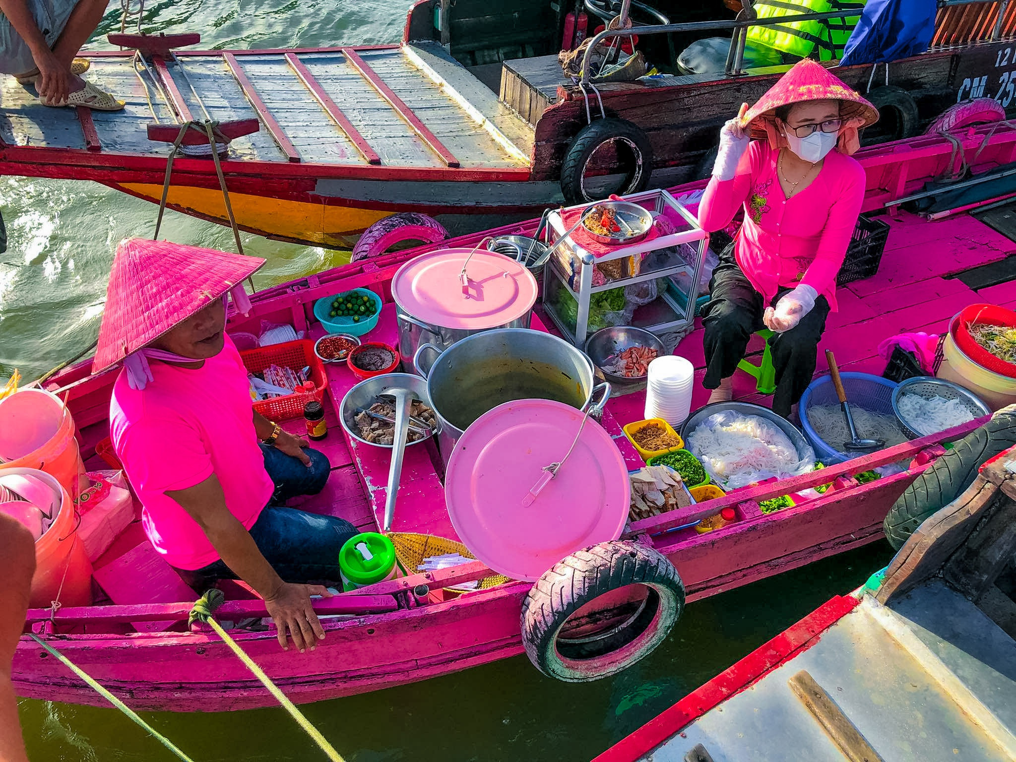 4h sáng, quán bún di động của anh Ngô Quốc Bảo và chị Nguyễn Thị Ngọc Linh bắt đầu mở hàng. Trong ánh sáng bình minh mờ ảo loang loáng, ghe bún riêu nổi bật giữa những chiếc ghe truyền thống có sắc nâu, sắc xanh. “Cả chợ có một mình nhà mình sơn ghe màu hồng thôi đó” – Anh Quốc Bảo chia sẻ.