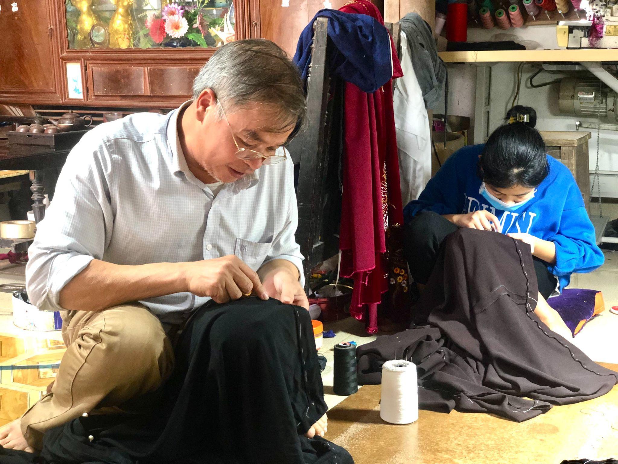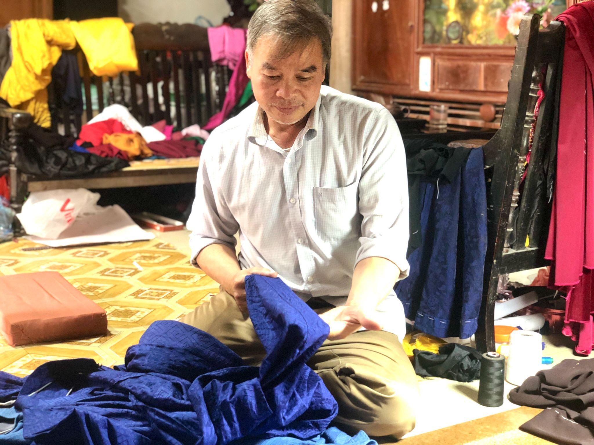 Nghệ nhân Đỗ Minh Tám cùng học trò đang chăm chú, tỉ mỉ hoàn thiện những chiếc áo dài theo đơn đặt hàng của khách (Ảnh: Tú Diễm) |