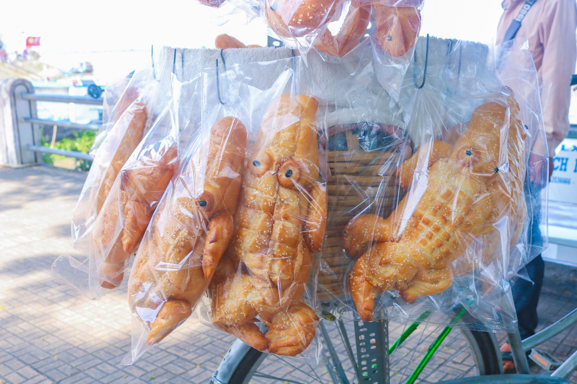 Tới Tân Châu, du khách không khó để bắt gặp hình ảnh những chiếc xe, gánh hàng rong chất đầy bánh mì có kích thước khủng, hình dáng độc lạ như cua hoàng đế, tôm hùm,… trong đó phổ biến nhất là bánh mì cá sấu.