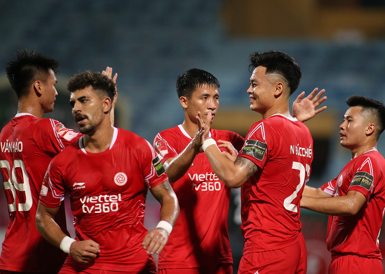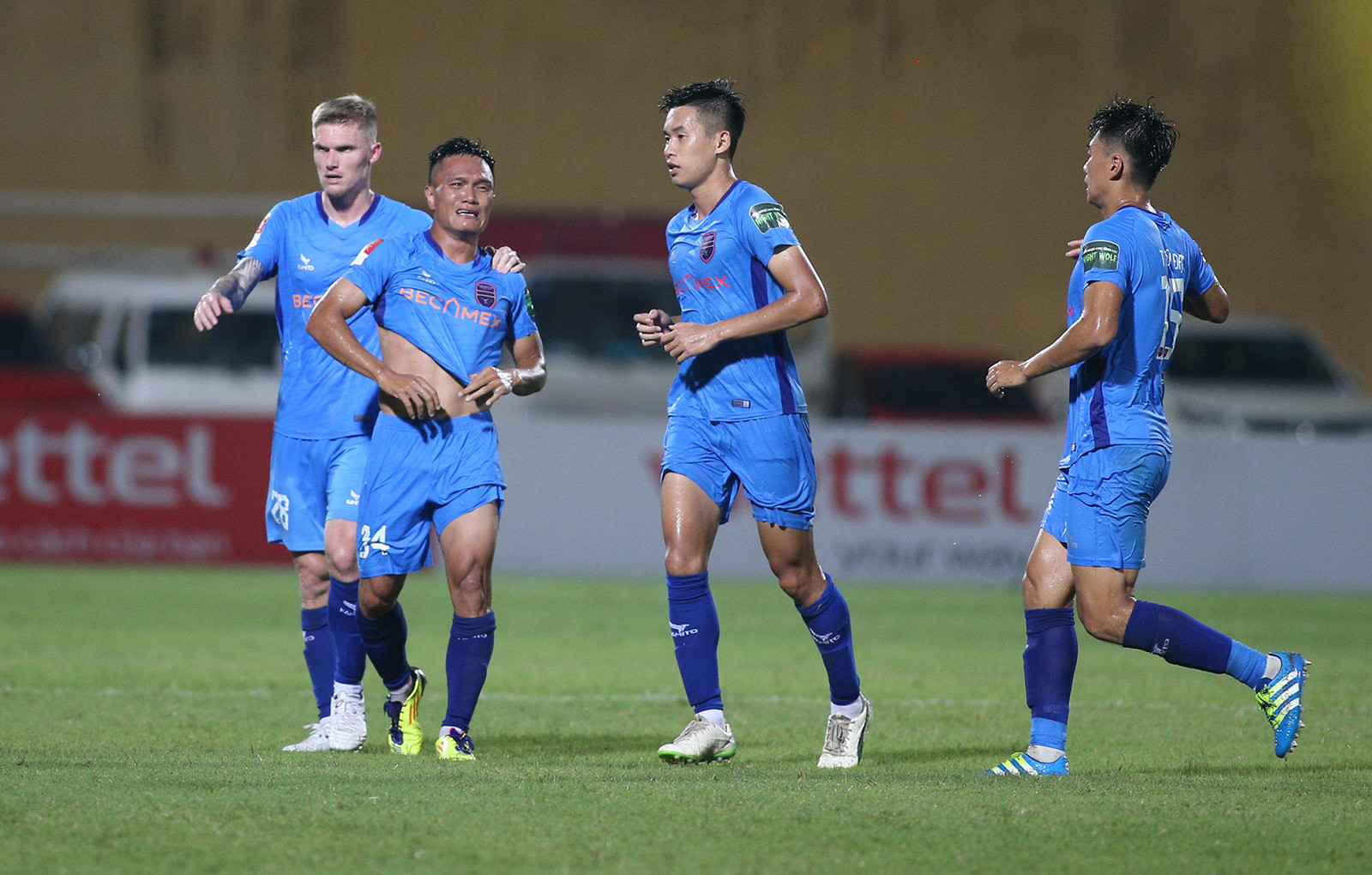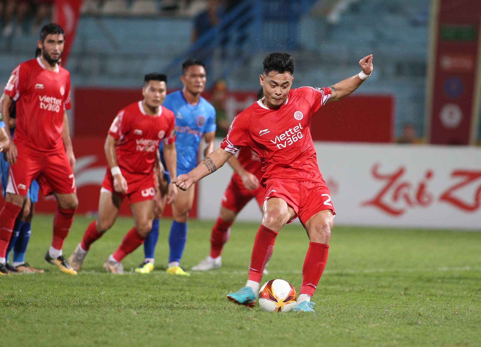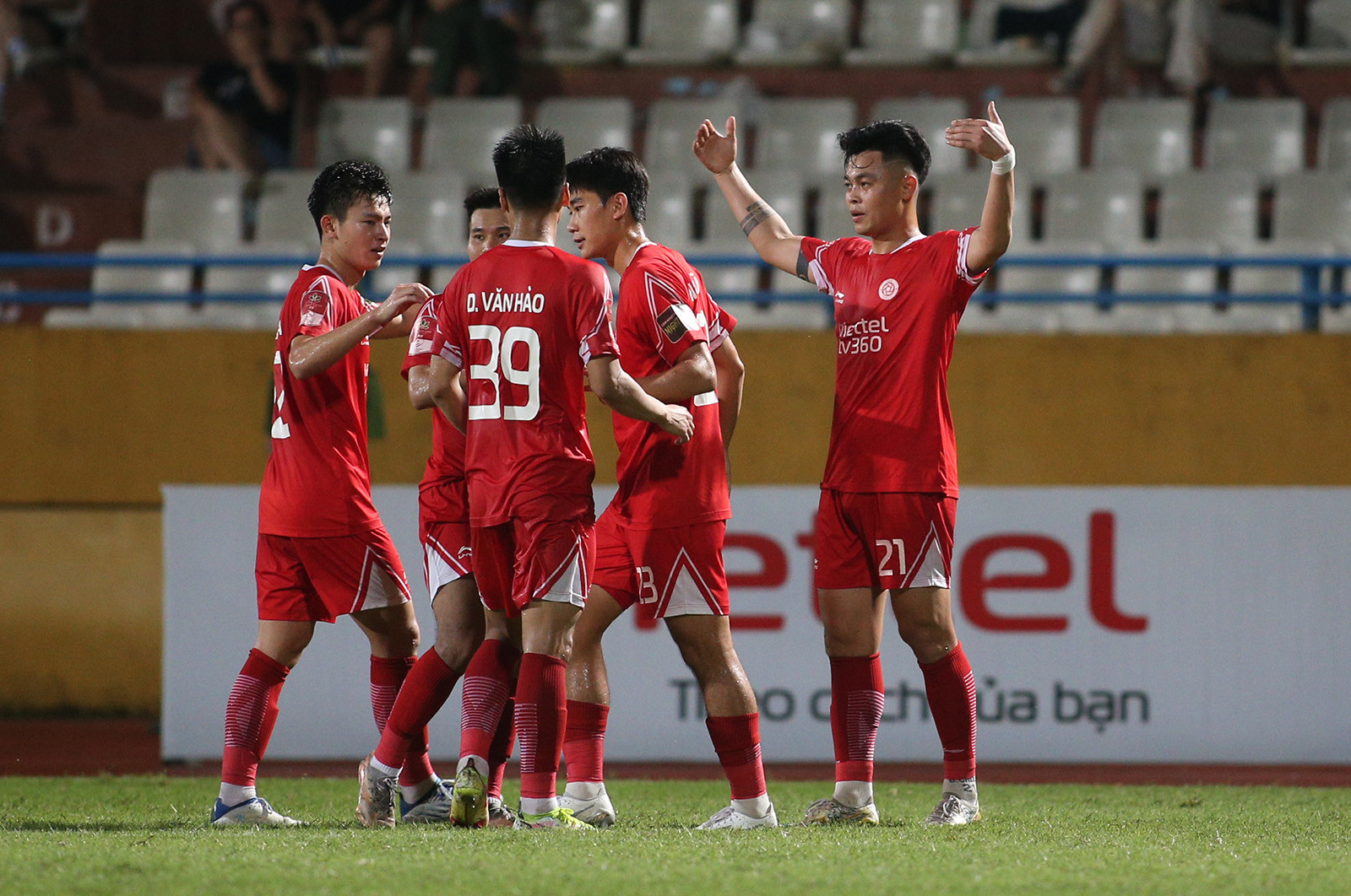 Tiếp Bình Dương trên sân nhà ở vòng 12 V-League, Viettel quyết tâm giành 3 điểm để chắc chắn có một suất trong top 8, qua đó đua vô địch ở giai đoạn 2.Phút 24, Dũ Đạt bên phía Bình Dương để tay chạm bóng trong vòng cấm, trọng tài Trần Ngọc Nhớ lập tức thổi phạt đền cho Viettel. Từ khoảng cách 11m, Đức Chiến dễ dàng đánh lừa thủ môn Minh Toàn mở tỉ số cho đội chủ nhà.Đức Chiến cùng các đồng đội ăn mừng bàn thắng.Điểm nhấn của trận đấu là bàn thắng gỡ hòa 1-1 của Quang Hùng ở phút bù giờ hiệp 1. Từ quả treo bóng của cầu thủ Bình Dương vòng cấm Viettel, thủ môn Văn Phong lao ra bắt bóng rồi để tuột khỏi tay khi tiếp đất. Quang Hùng lập tức dứt điểm vào lưới trống.Đây là bàn thắng đầu tiên của hậu vệ người Nam Định kể từ khi trở lại thi đấu chuyên nghiệp sau hơn 9 năm thi hành án kỉ luật của VFFNăm 2014, cựu tuyển thủ Lê Quang Hùng là 1 trong 9 cầu thủ bị VFF ra quyết định cấm thi đấu vĩnh viễn khi tham gia dàn xếp tỉ số ở trận đấu của Ninh Bình với CLB Kelantan (Malaysia) tại AFC Cup.Trở lại V-League sau khi được VFF giảm án, tân binh của CLB Bình Dương phải chịu thời gian thử thách là 6 tháng theo quy định về kỷ luật của VFF. Sau khi ghi bàn, Quang Hùng chạy từ phía khung thành Viettel về khu kỹ thuật đội nhà rồi ôm lấy HLV Huỳnh Đức và bật khóc.Đây chắc chắn là một trong những bàn thắng mang lại cảm xúc nhiều nhất trong sự nghiệp thi đấu của cựu tuyển thủ Việt Nam.Sau khi bị gỡ 1-1, Viettel đẩy cao đội hình chơi tấn công trong hiệp 2.Phút 64, nhận bóng từ chân đồng đội, Đức Chiến dứt điểm sát vòng cấm, thủ môn Minh Toàn để bóng vuột qua tay rồi lăn vào lưới. Với chiến thắng 2-1, Viettel lọt vào top 4 V-League.