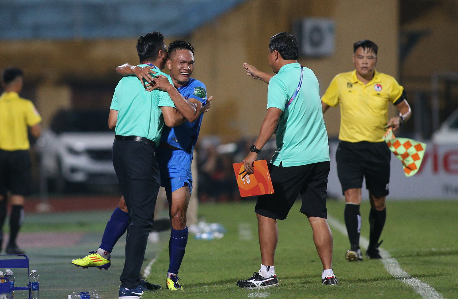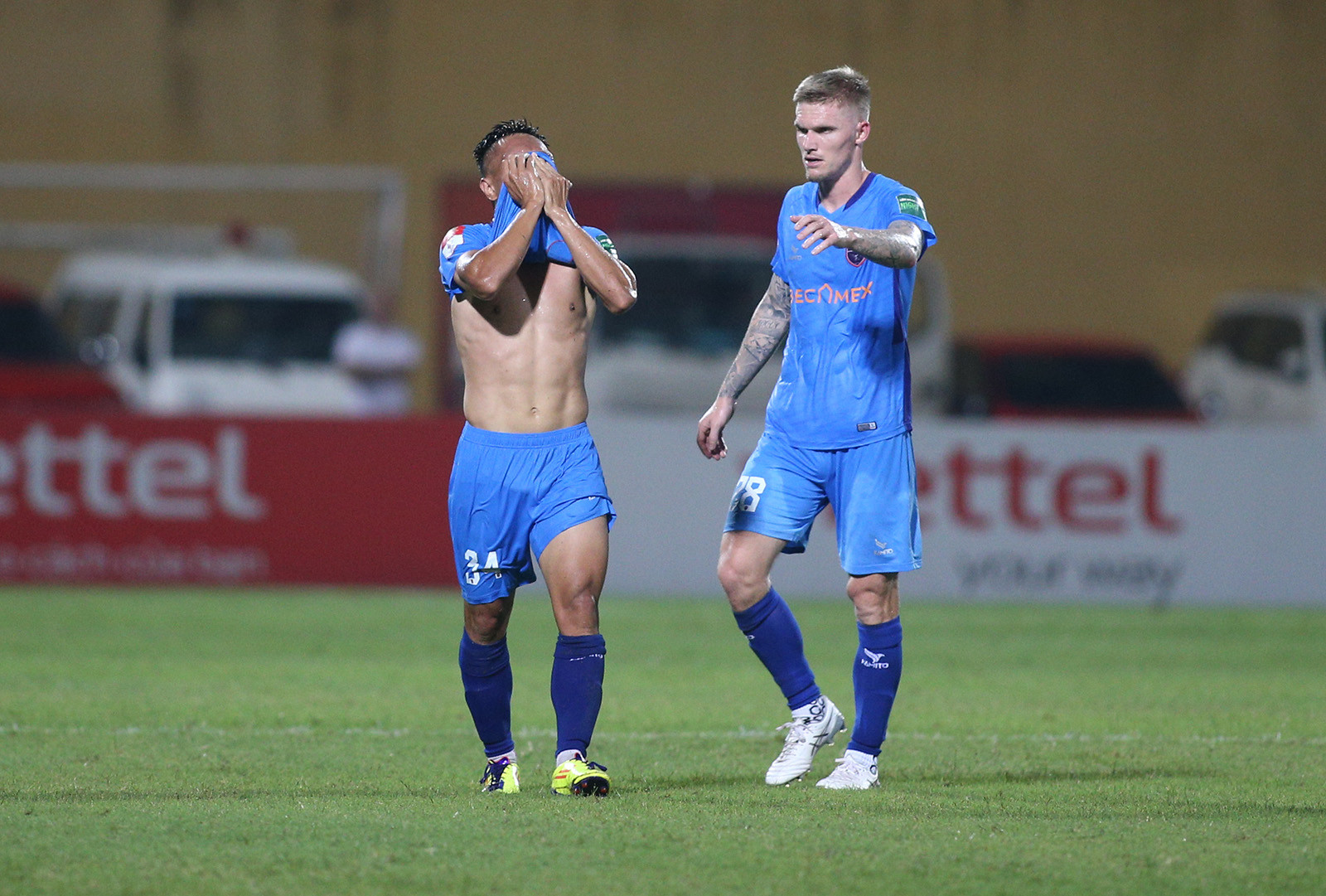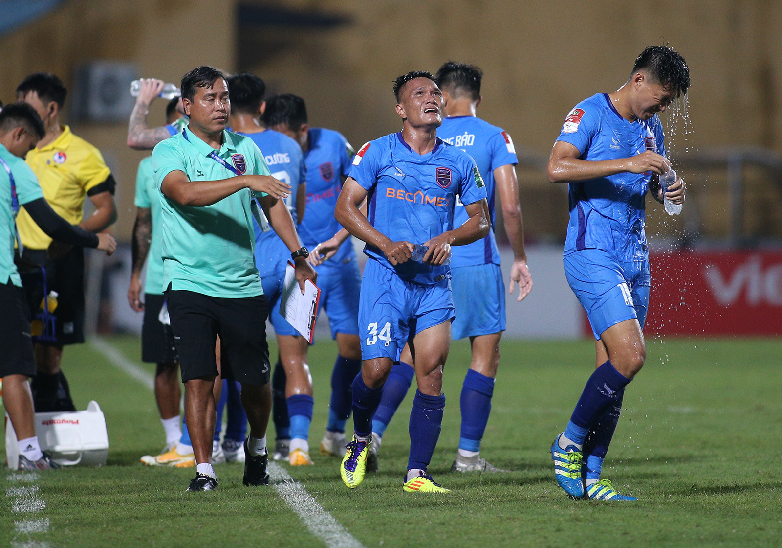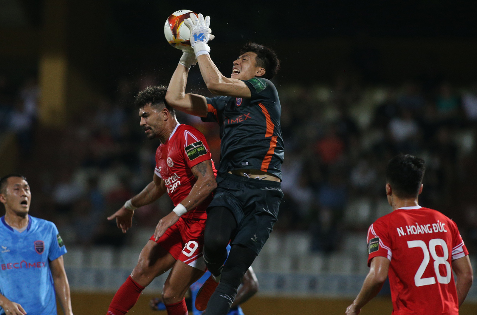 Tiếp Bình Dương trên sân nhà ở vòng 12 V-League, Viettel quyết tâm giành 3 điểm để chắc chắn có một suất trong top 8, qua đó đua vô địch ở giai đoạn 2.Phút 24, Dũ Đạt bên phía Bình Dương để tay chạm bóng trong vòng cấm, trọng tài Trần Ngọc Nhớ lập tức thổi phạt đền cho Viettel. Từ khoảng cách 11m, Đức Chiến dễ dàng đánh lừa thủ môn Minh Toàn mở tỉ số cho đội chủ nhà.Đức Chiến cùng các đồng đội ăn mừng bàn thắng.Điểm nhấn của trận đấu là bàn thắng gỡ hòa 1-1 của Quang Hùng ở phút bù giờ hiệp 1. Từ quả treo bóng của cầu thủ Bình Dương vòng cấm Viettel, thủ môn Văn Phong lao ra bắt bóng rồi để tuột khỏi tay khi tiếp đất. Quang Hùng lập tức dứt điểm vào lưới trống.Đây là bàn thắng đầu tiên của hậu vệ người Nam Định kể từ khi trở lại thi đấu chuyên nghiệp sau hơn 9 năm thi hành án kỉ luật của VFFNăm 2014, cựu tuyển thủ Lê Quang Hùng là 1 trong 9 cầu thủ bị VFF ra quyết định cấm thi đấu vĩnh viễn khi tham gia dàn xếp tỉ số ở trận đấu của Ninh Bình với CLB Kelantan (Malaysia) tại AFC Cup.Trở lại V-League sau khi được VFF giảm án, tân binh của CLB Bình Dương phải chịu thời gian thử thách là 6 tháng theo quy định về kỷ luật của VFF. Sau khi ghi bàn, Quang Hùng chạy từ phía khung thành Viettel về khu kỹ thuật đội nhà rồi ôm lấy HLV Huỳnh Đức và bật khóc.Đây chắc chắn là một trong những bàn thắng mang lại cảm xúc nhiều nhất trong sự nghiệp thi đấu của cựu tuyển thủ Việt Nam.Sau khi bị gỡ 1-1, Viettel đẩy cao đội hình chơi tấn công trong hiệp 2.Phút 64, nhận bóng từ chân đồng đội, Đức Chiến dứt điểm sát vòng cấm, thủ môn Minh Toàn để bóng vuột qua tay rồi lăn vào lưới. Với chiến thắng 2-1, Viettel lọt vào top 4 V-League.