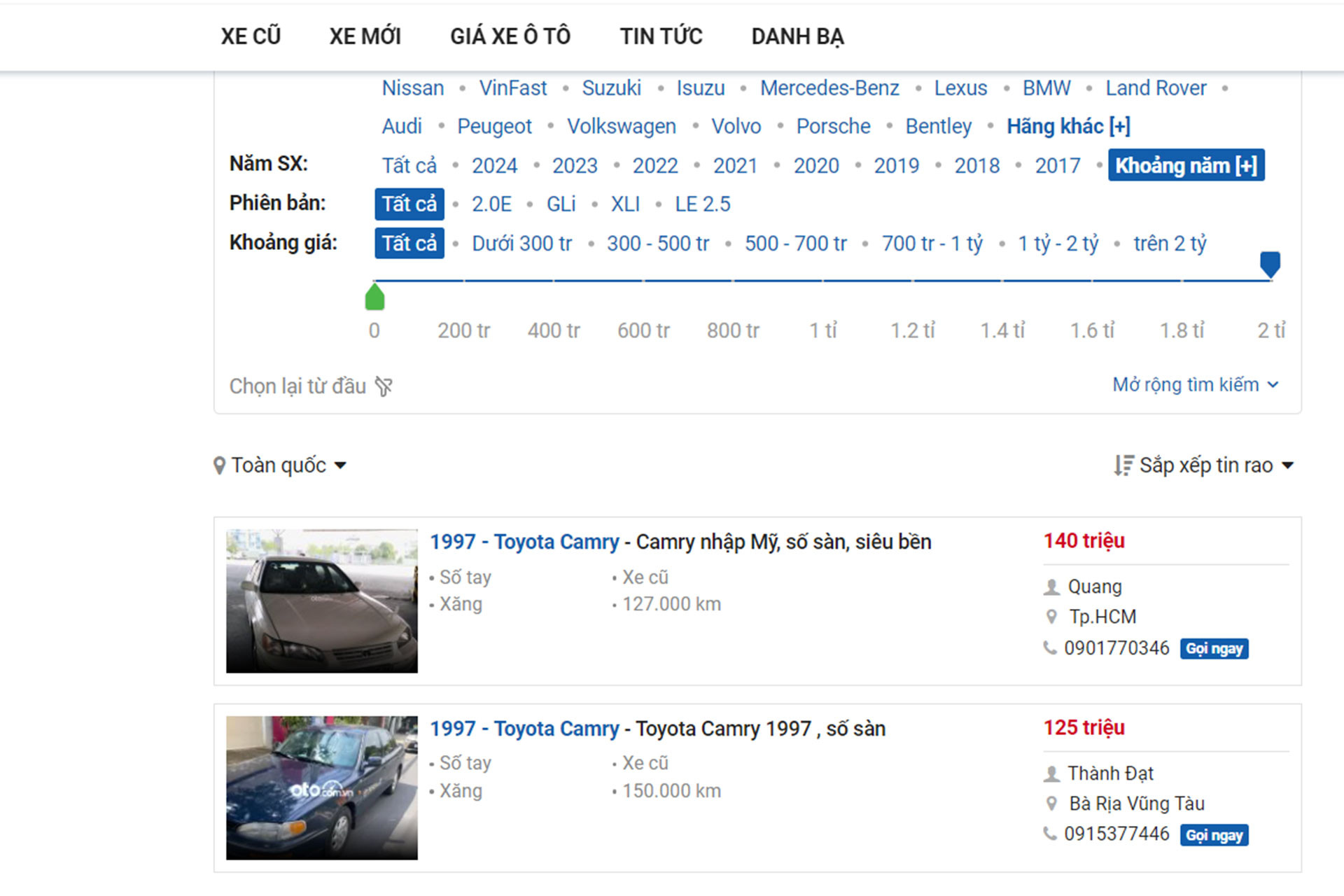Mới đây, một chủ xe ở Ninh Bình cũng chào bán chiếc Toyota Camry 2.2L GLI sản xuất 1997, nhập khẩu từ Nhật Bản với giá chỉ 50 triệu đồng. Theo một số hình ảnh được chia sẻ, chiếc xe sở hữu ngoại thất màu trắng. Nhiều vị trí trên thân xe và cả cản trước bị xước xát nhẹ.