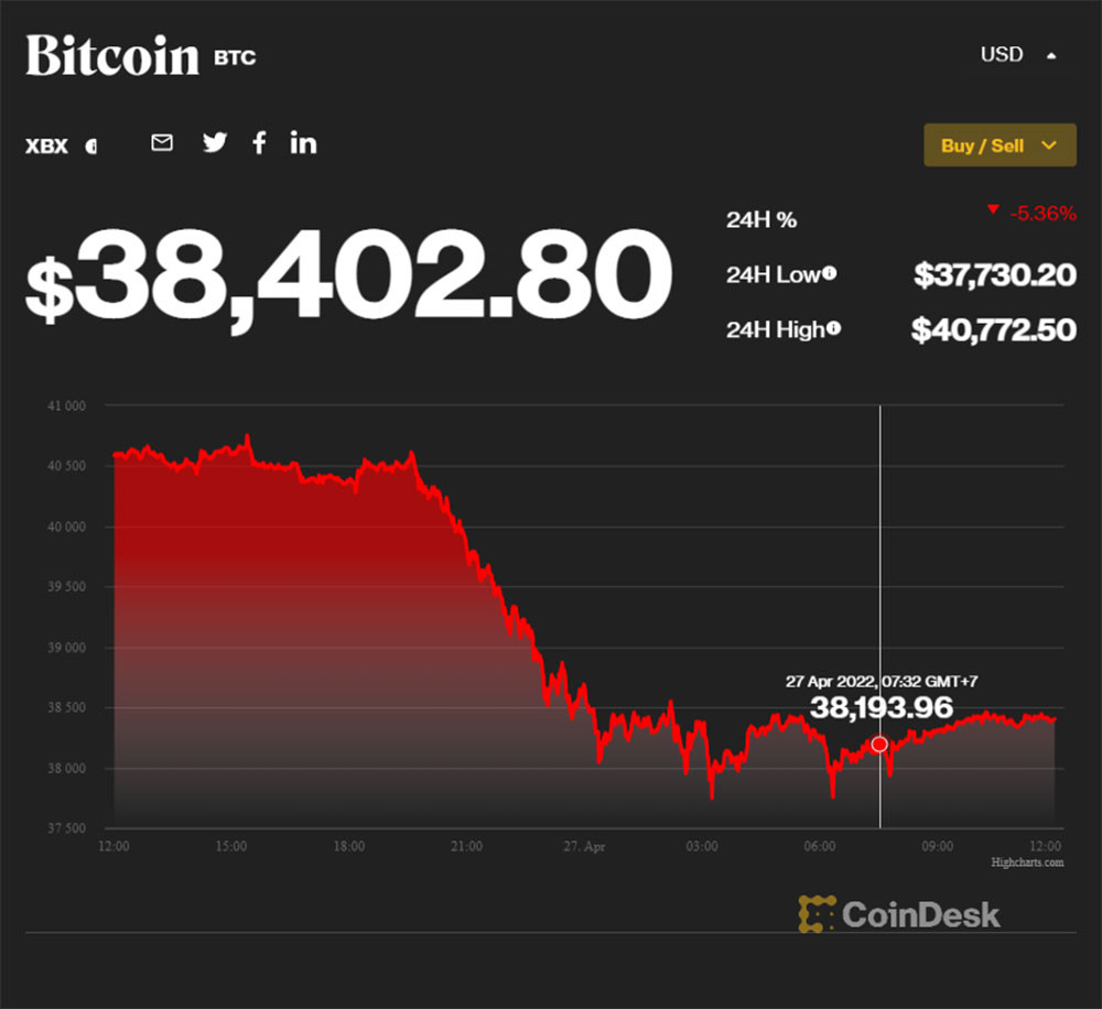 Vào ngày hôm qua (26/4), giá Bitcoin đã hồi phục lên vùng giá trên 40.000 USD. Tuy nhiên, đến hôm nay (27/4), giá Bitcoin lại bất ngờ lao dốc, có thời điểm về mốc 37.000 USD. Giá Bitcoin hiện được giao dịch ở mức 38.000 USD/đồng.