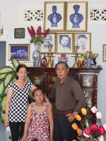 | Ông bà Trần Trinh Đức và con gái Trần Thị Phượng trước bàn thờ ông bà tại nhà riêng. |